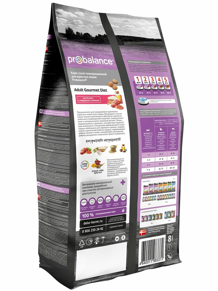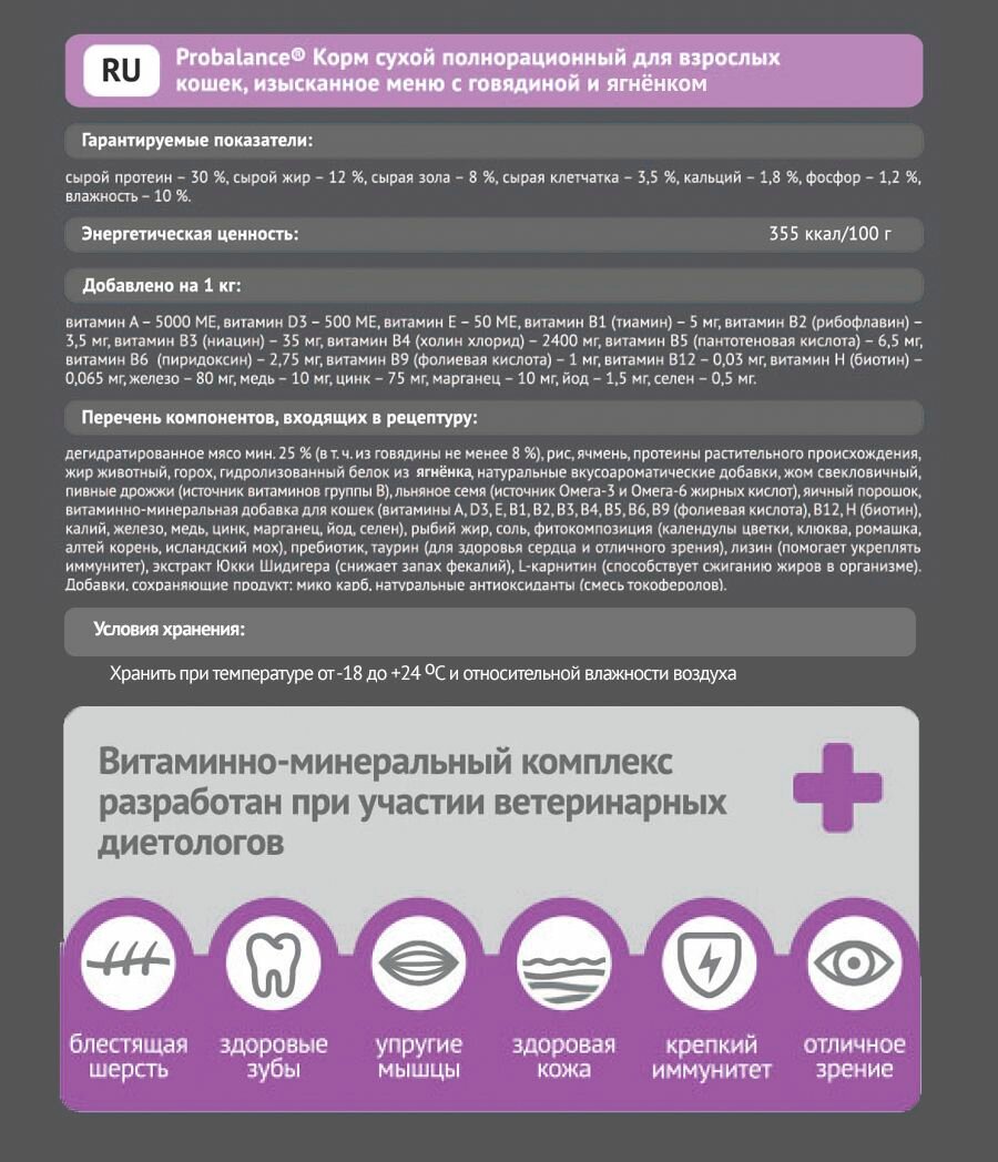 Probalance Корм сухой полнорационный для взрослых кошек, изысканное меню с говядиной и ягненком, мешок 8 кг.: сравнение цен, характеристики, фото, актуальное наличие и цены.