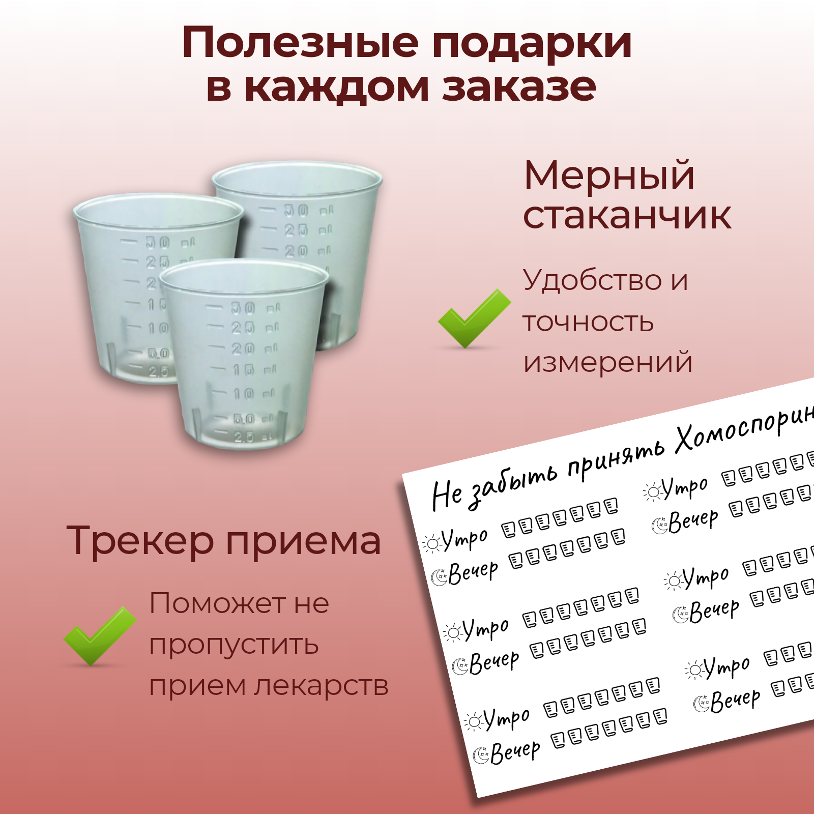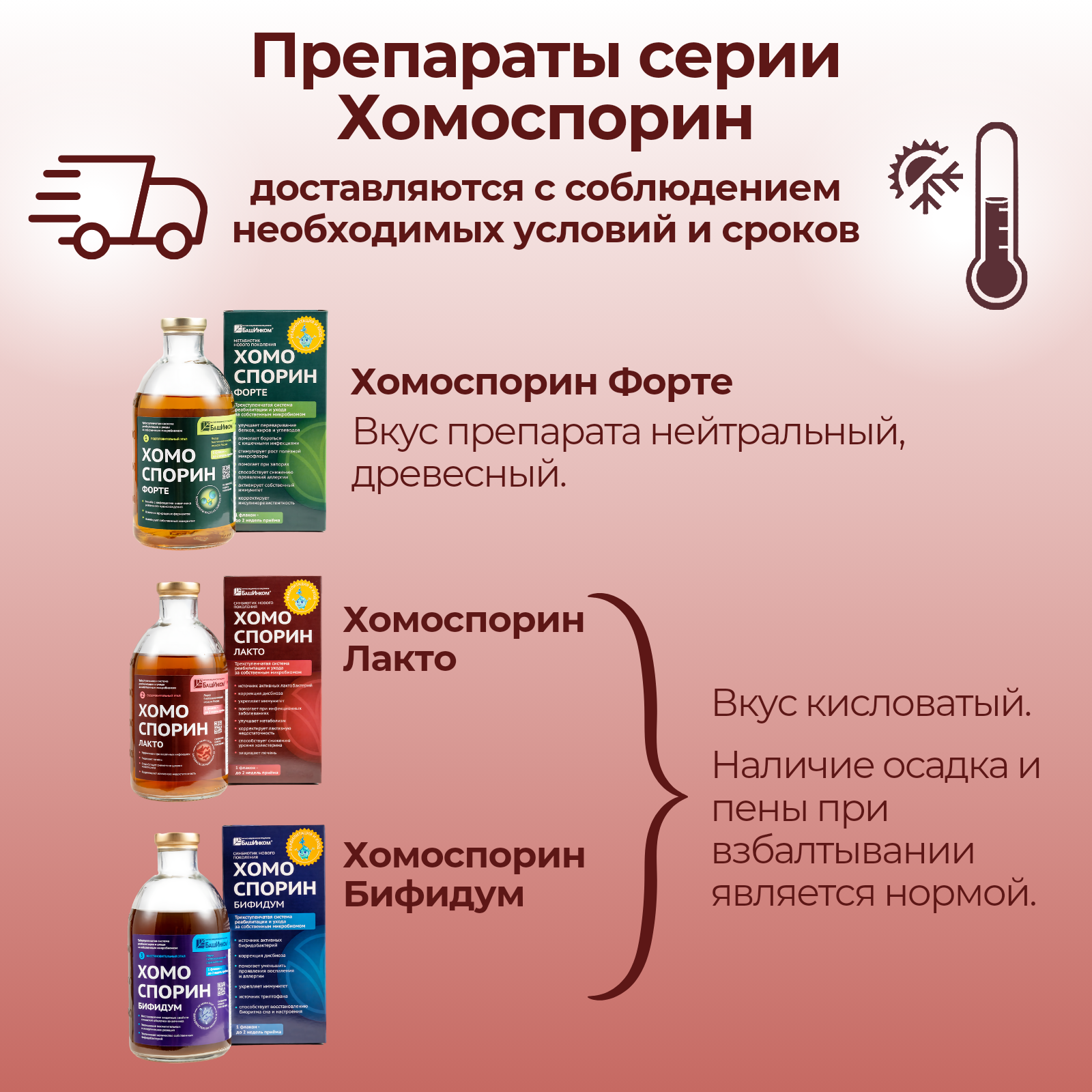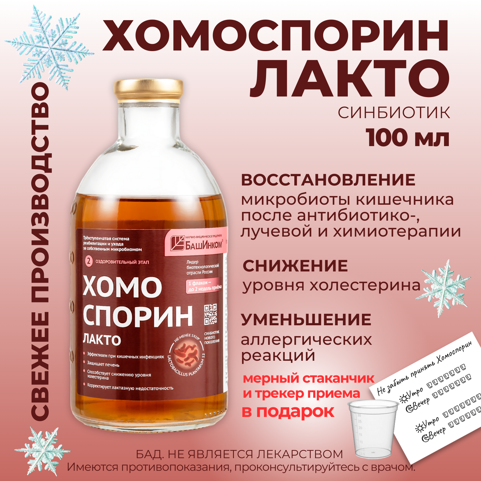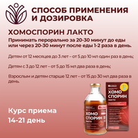 Препарат для устранения кишечных инфекций различной этиологии. Применим для детей, взрослых, пожилых людей. В жидкой форме. Восстанавливает и поддерживает нормальную микрофлору кишечника, здоровое пищеварение. Восстанавливает микробиоту кишечника после антибиотико-, гормональной, лучевой и химиотерапии, создает защитный барьер стенок кишечника, улучшает работу печени и обмен веществ в организме, поддерживает баланс микрофлоры кишечника, создает в нем защитный барьер, снижает уровень холестерина и усиливает иммунную защиту организма. Пребиотик арабиногалактан – обладает гепатопротекторным действием, улучшает пищеварение и способствует повышению выживаемости лактобактерий. Преимущества: - активная формула начинает работать с момента приема - адгезия высокая степень адгезии к эпителиальным клеткам слизистых оболочек ЖКТ - безопасность 100 % натуральный состав, не содержит ГМО - устойчивость устойчив к кислой среде желудка - улучшенный состав усилен метабиотиком и пребиотиком - разрешен детям с 3 лет. Хомоспорин Лакто принимать перорально за 20-30 минут до еды или через 20-30 минут после еды 1-2 раза в день. Перед употреблением взболтать, вскрыть флакон и отмерить необходимое количество. При необходимости разбавить кипяченой водой или другой пищевой жидкостью комнатной температуры, употребить сразу. Детям от 12 месяцев до 3 лет – от 5 до 10 мл один раз в день; Детям с 3 до 12 лет – от 5 до 15 мл два раза в день; Взрослым и детям старше 12 лет – от 15 до 30 мл два раза в день. Курс приема – 14-21 день. Хранить в сухом, недоступном для детей месте, при температуре от +2 °С до +8 °С. Вскрытый флакон хранить с плотно закрытой крышкой в холодильнике не более 14 суток. При хранении образуется осадок. Не применять по истечении срока годности. Допускается транспортирование при температуре с +9°С до +25 °С не более 5 суток. Программа содержит 3 последовательных этапа, включающих в себя: 1) подготовительный с приемом метабиотика «Хомоспорин Форте», 2) оздоровительный , содержащий прием синбиотика Хомоспорин Лакто 3) восстановительный с применением синбиотика Хомоспорин Бифидум. Все три версии «Хомоспорин» работают с первых минут приема, начиная с ротовой полости. Имеет нейтральный вкус. Медицинский стерильный флакон. Российское производство. Разработка российских ученых. Это единственный в мире продукт на основе метаболитов сенной палочки (патентованный штамм ЗН). Эффективность научно доказана. Биологически активная добавка (бад) к пище для людей. Можно брать с собой в путешествие! Не является лекарственным средством! Внимание! Начинать курс реабилитации строго с Хомоспорин Форте!