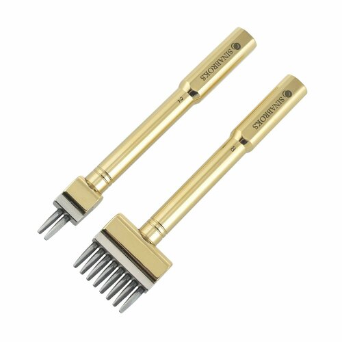 Набор пробойников премиального уровня, европейского (французского) типа от корейского производителя Sinabroks. Сделан из литой латуни и нержавеющей стали, имеет оптимально сбалансированный вес для постоянного использования. Все пробойники имеют полированные зубы для легкого прокалывания даже толстой кожи и оставляют аккуратные отверстия, подходящие под все основные размеры нитей. Оптимальные размеры зубьев пробойника, позволяют работать с ними без дальнейшего использования шила.