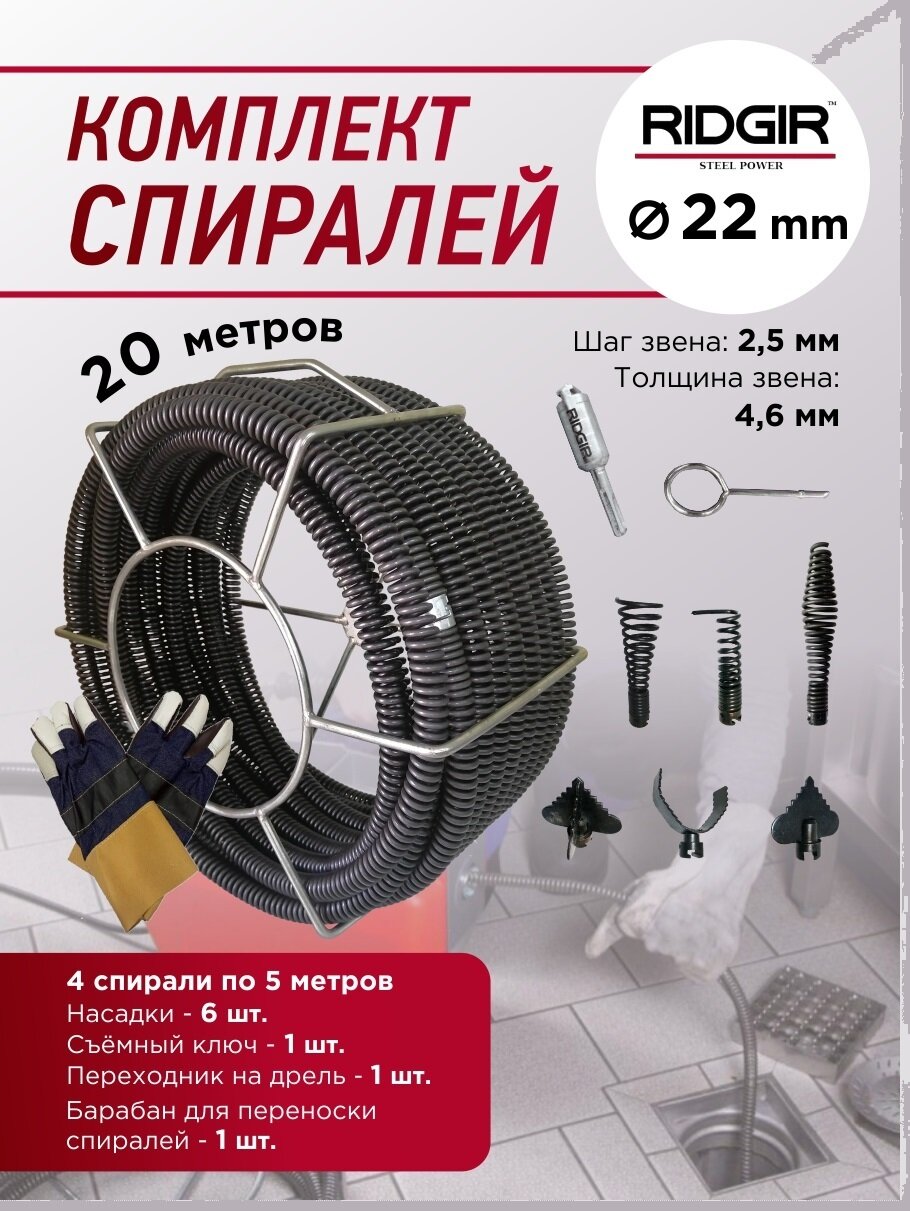 Профессиональная прочистная спираль RID-GIR 22мм 20м комплект для эффективной сантехнической работы.