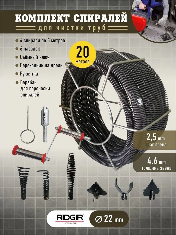 Прочистная спираль RID-GIR 22мм 20м комплект. Трос сантехнический для прочистки канализации: сравнение цен, характеристики, фото, актуальное наличие и цены.