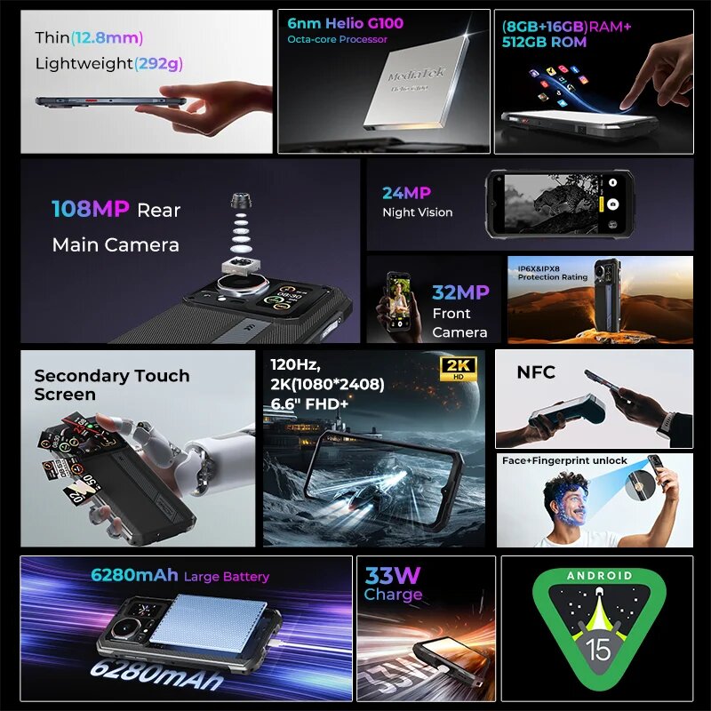 Прочный телефон HOTWAV Cyber 16 Pro G100, 108 МП, мобильный телефон, 6,6-дюймовый FHD + 2K-дисплей, 8 ГБ, 512 ГБ, смартфон, мобильный телефон Android 15: сравнение цен, характеристики, фото, актуальное наличие и цены.