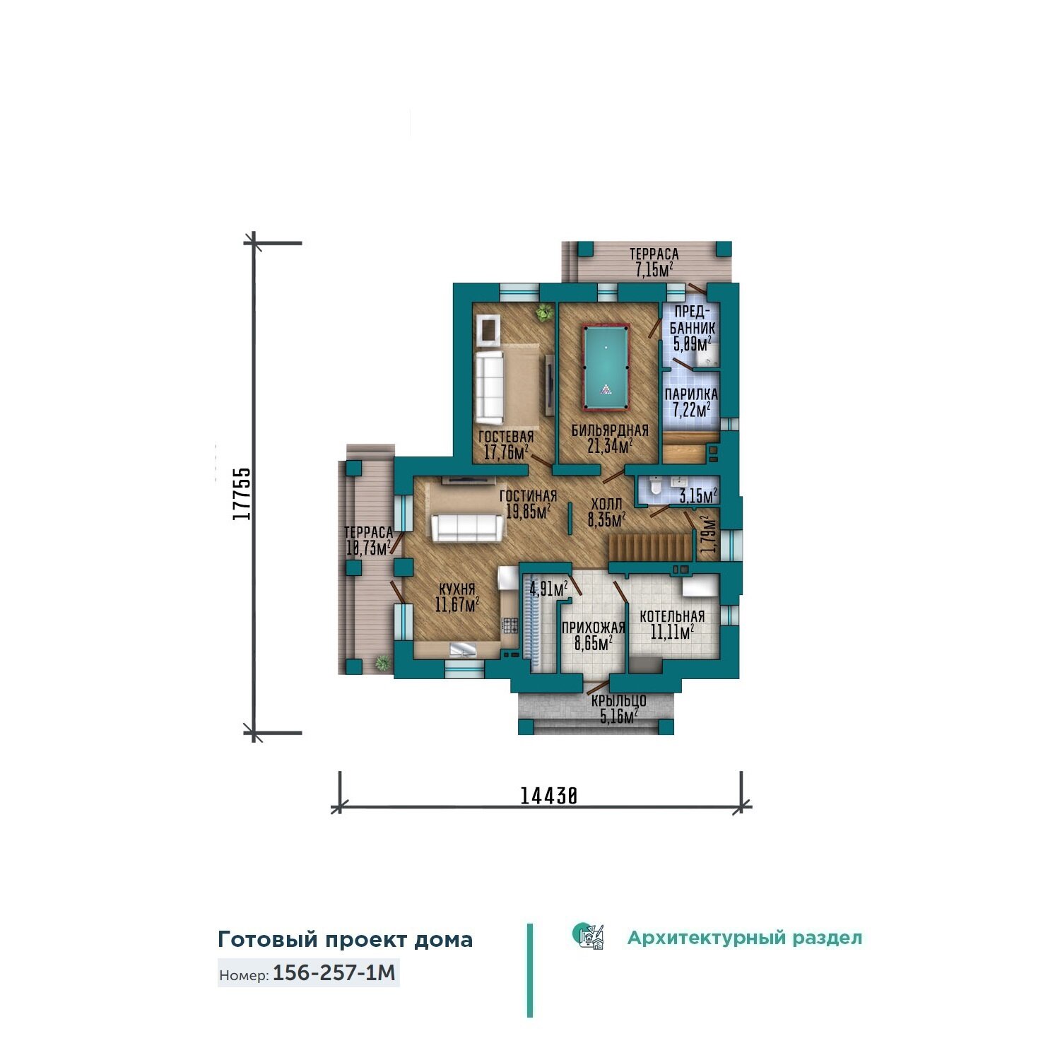 Купить Проект большого коттеджа с террасой, банным комплексом и балконом на втором этаже 156-257-1М с доставкой по всей России.