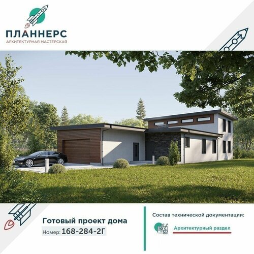 Купить Проект дома для узкого участка с плоской кровлей, внутренней террасой и выступающим гаражом 168-284-2Г (АР) с доставкой по всей России.