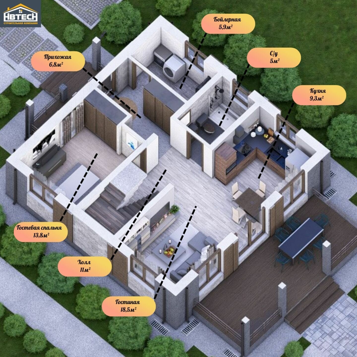 | Комнаты и помещения | ванная, гостиная, кабинет, котельная, кухня-столовая, подсобное помещение, санузел, терраса |