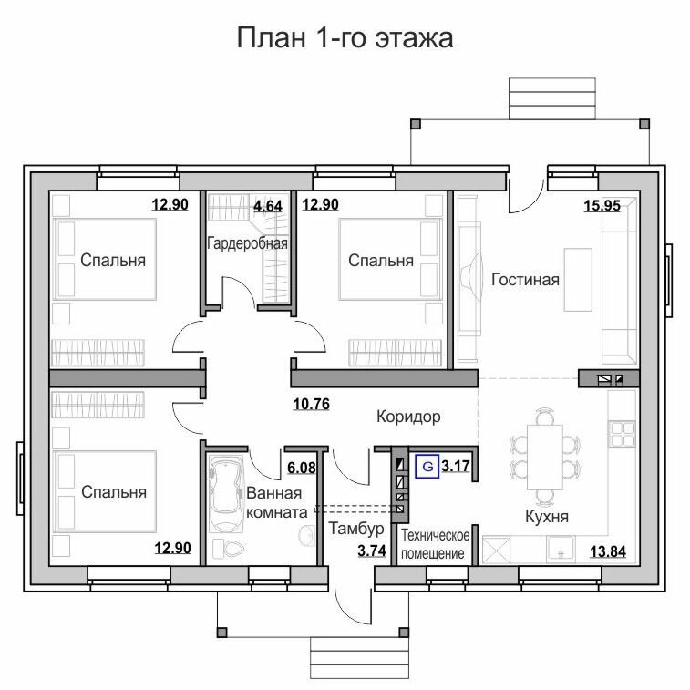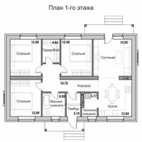 Планировочными решениями в доме предусмотрены три спальни (жилые комнаты), объединённая кухня с гостиной и совмещенный санузел. Отопительное оборудование располагается на кухне (в кухонной зоне).