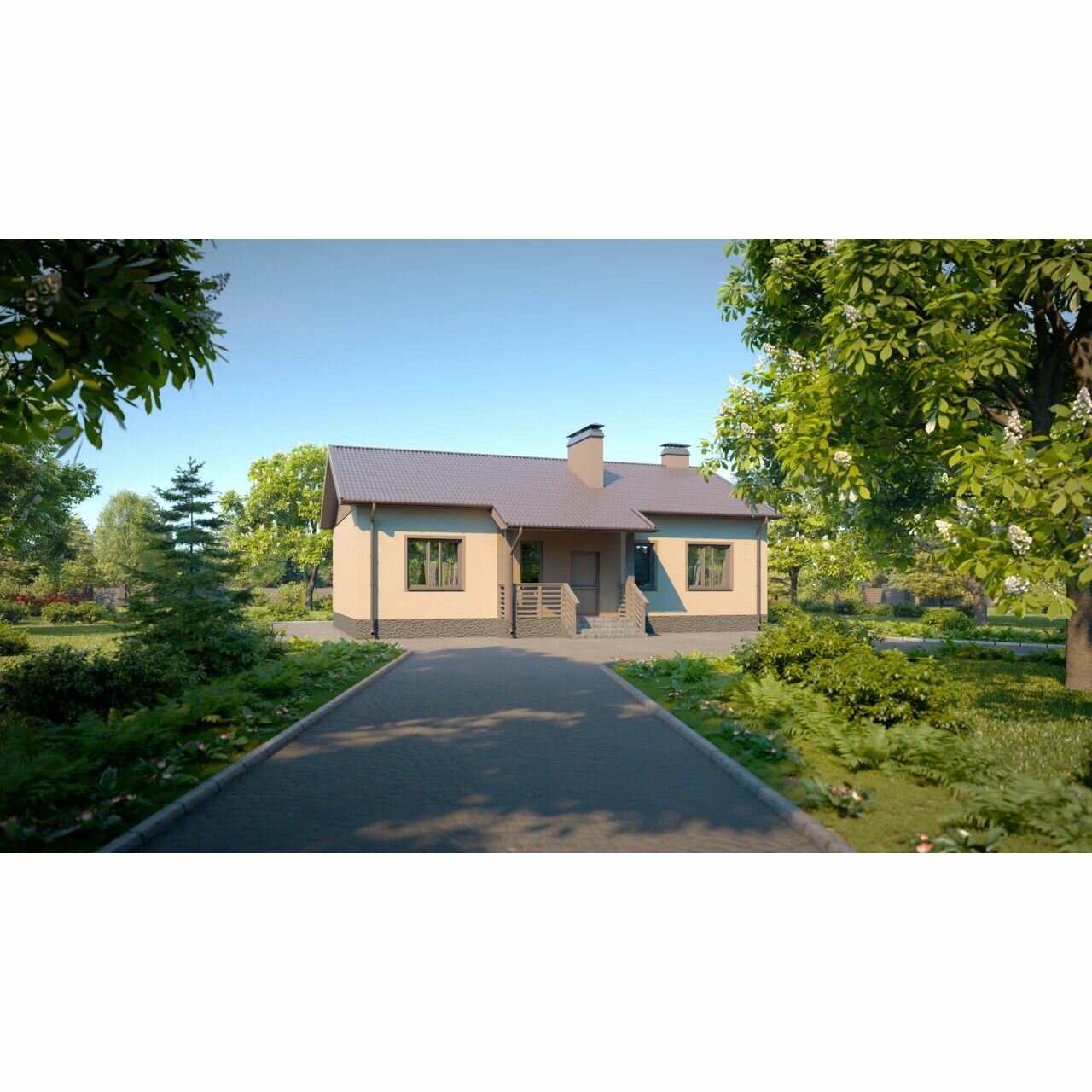 Проект одноэтажного дома в современном стиле с площадью помещений 97 квадратных метров. Дом из пеноблоков с отделкой декоративной штукатуркой завершен двухскатной кровлей.