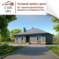 Проект одноэтажного дома в классическом стиле с площадью помещений 106 квадратных метров. Дом из пеноблоков с отделкой декоративной штукатуркой завершен четырёхскатной кровлей. Чердачные перекрытия по деревянным балкам.