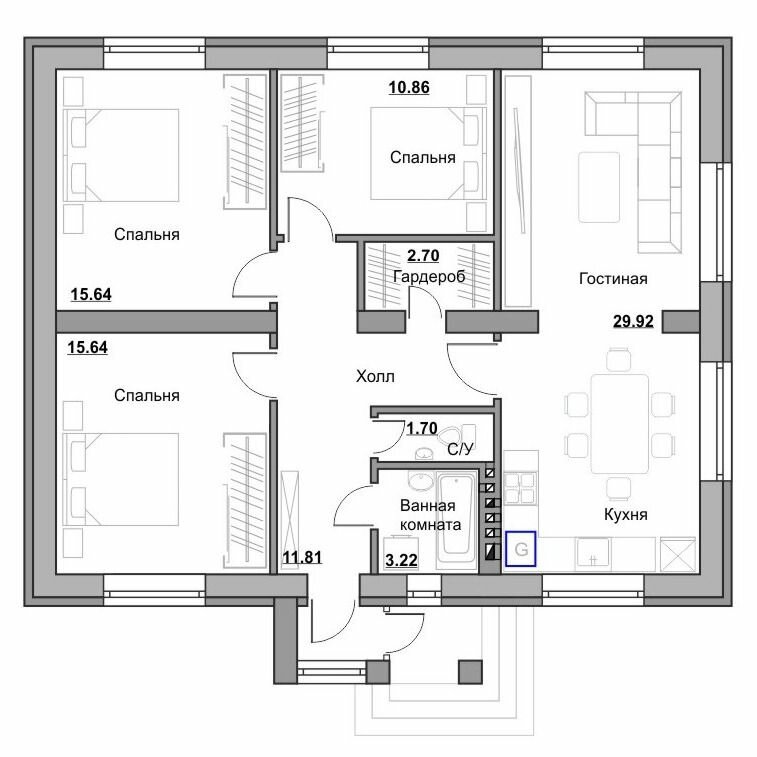 Планировочными решениями в доме предусмотрены три спальни (жилые комнаты), объединённая кухня с гостиной и раздельный санузел. Отопительное оборудование располагается на кухне (в кухонной зоне). Большие панорамные окна от пола придают изысканности внешнему виду дома и делают помещения светлее.