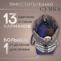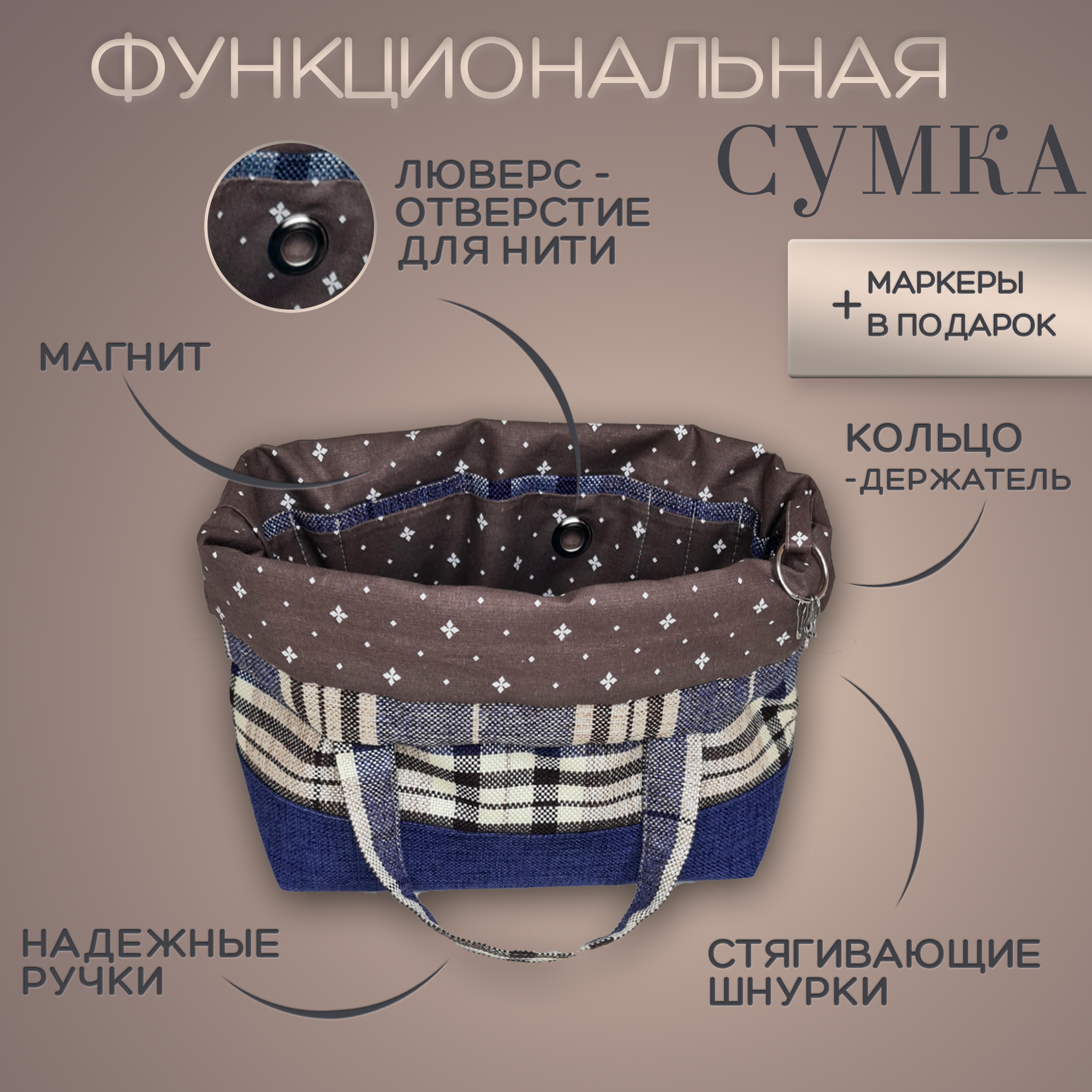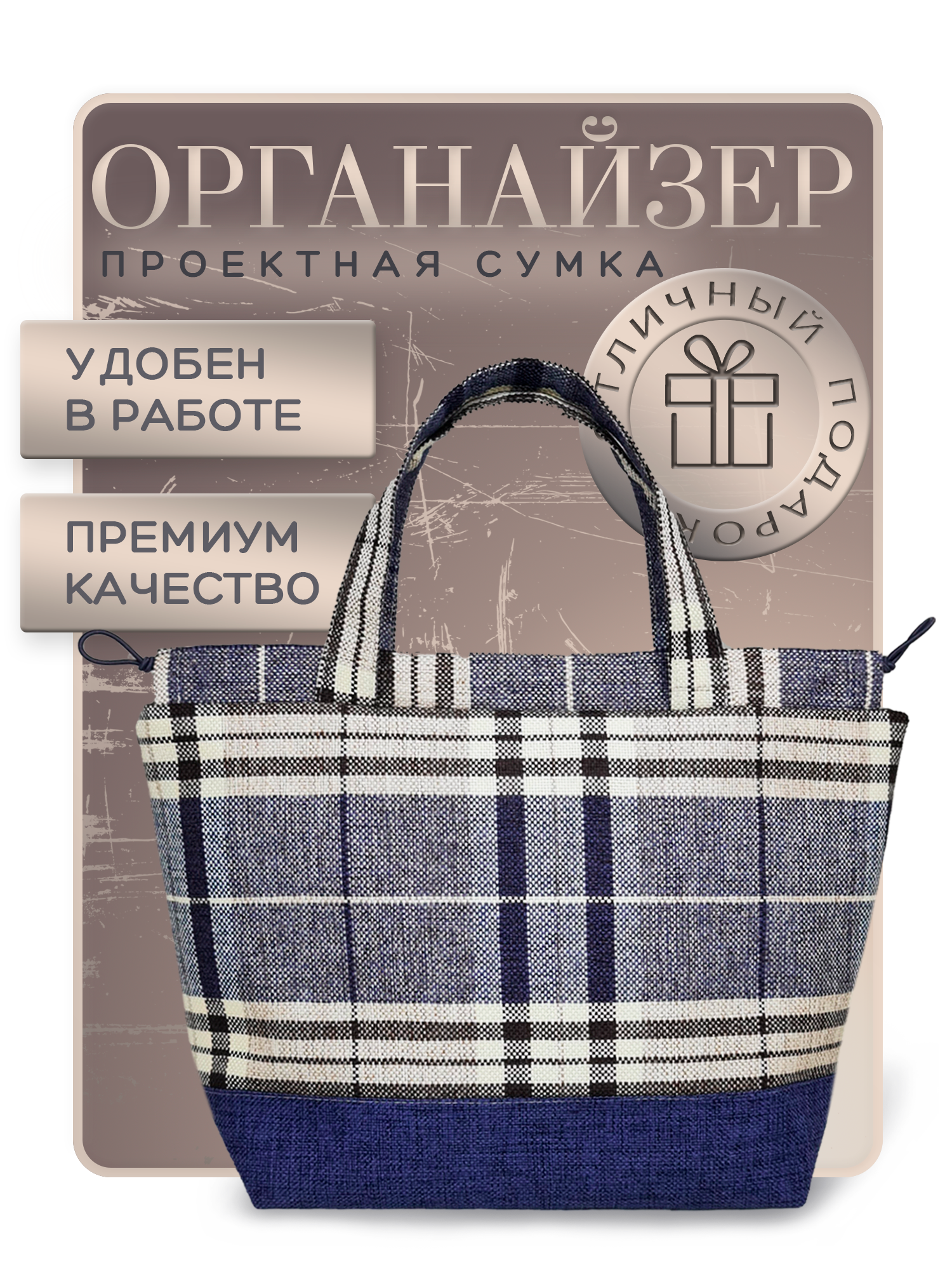 Проектная сумка для вязания и рукоделия (большого размера: высота 28,5 см, ширина 41 см, дно 14,5 х 27 см), украшенная тканью-компаньон. Сумка темно-синего цвета в серо-бежевую клетку выглядит максимально эффектно и очень стильно. Такая будет, только у Вас! Сумка на темно-коричневой подкладке с рисунком молочного цвета затягивается на шнурок с двух сторон. Внутри по всему периметру 13 карманов разного размера - от самых узких: для крючков, ножниц (сниппера), ручки, маркера, сантиметровой ленты, наперстка, до самых вместительных: для набора спиц, схем, блокнота, телефона, подставки под телефон, счетчика рядов и других принадлежностей, которые будут у Вас всегда под рукой. Сумка поможет организовать рабочие пространство и держать в порядке все нужные инструменты для рукоделия. Имеются две ручки длинной 40 см, металлический люверс для пряжи, разъемное кольцо для маркеров в подарок и небольшой магнит для временного прикрепления маленьких металлических предметов. Проектную сумку удобно брать с собой в дорогу, на прогулку, в путешествие, везде, где можно присесть и получить удовольствие от любимого занятия. Захотел повязать - достал сумку, а все необходимое уже в ней. Это отличный подарок любимой маме и дочке, жене и бабушке, тёте и свекрови или сестре и коллеги по работе на день рождения, 8 марта, день матери, день учителя, 14 февраля или Новый год. Обратите внимание: сумка продается пустой, без внутреннего вязального реквизита, который есть на фотографиях. Изображения и цвет представленного товара могут незначительно отличаться от оригинала продукции, в зависимости от разрешения и настроек вашего монитора, а также условий освещения при съемке.