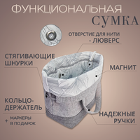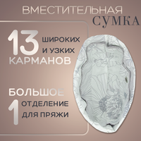 Проектная сумка для вязания и рукоделия (большого размера: высота 28,5 см, ширина 41 см, дно 14,5 х 27 см), украшенная тканью-компаньон. Цвета: светло-серый и серый. Сумка выглядит максимально эффектно и очень стильно. Такая будет, только у Вас! Свежесть и нежность заложены в сочетании цветов сумки. Сумка на подкладке 100% хлопок белого цвета с серым рисунком затягивается на шнурок с двух сторон. Внутри по всему периметру 13 карманов разного размера - от самых узких: для крючков, ножниц (сниппера), ручки, маркера, сантиметровой ленты, наперстка, до самых вместительных: для набора спиц, схем, блокнота, телефона, подставки под телефон, счетчика рядов и других принадлежностей, которые будут у Вас всегда под рукой. У вышивальщиц уберутся пяльцы, вышивка, схема, ножнички, магниты, игольницы, канва и т. д. Сумка поможет организовать рабочие пространство и держать в порядке все нужные инструменты для рукоделия. Имеются две ручки длинной 40 см, металлический люверс для пряжи, разъемное кольцо для маркеров в подарок и небольшой магнит для временного прикрепления маленьких металлических предметов. Проектную сумку удобно брать с собой в дорогу, на прогулку, в путешествие, везде, где можно присесть и получить удовольствие от любимого занятия. Захотел повязать - достал сумку, а все необходимое уже в ней. Это отличный подарок любимой маме и дочке, жене и бабушке, тёте и свекрови или сестре и коллеги по работе на день рождения, 8 марта, день матери, день учителя, 14 февраля или Новый год. Обратите внимание: сумка продается пустой, без внутреннего вязального реквизита, который есть на фотографиях. Изображения и цвет представленного товара могут незначительно отличаться от оригинала продукции, в зависимости от разрешения и настроек вашего монитора, а также условий освещения при съемке.