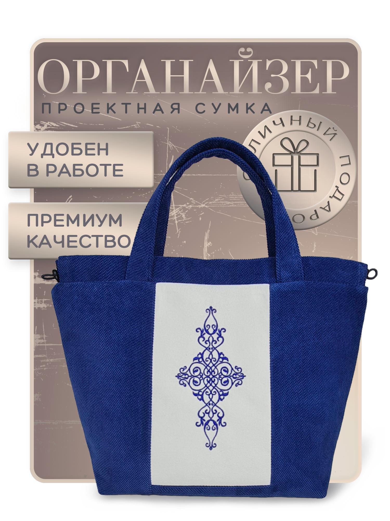 Проектная сумка для вязания и рукоделия (большого размера: высота 28,5 см, ширина 41 см, дно 14,5 х 27 см). Сумка украшена монохромной вышивкой. Внешняя ткань - матовый велюр c 3D текстурой. Цвет потрясающий - синий сапфир. Таких сумок - единицы! Строгость, элегантность, изящество заложены в сочетании цветов сумки. Проектная сумка на белой подкладке с серебристым рисунком 100% хлопок затягивается на шнурок с двух сторон. Внутри по всему периметру 13 карманов разного размера - от самых узких: для крючков, ножниц(сниппера), ручки, маркера, сантиметровой ленты, наперстка, до самых вместительных: для набора спиц, схем, блокнота, телефона, подставки под телефон, счетчика рядов и других принадлежностей, которые будут у Вас всегда под рукой. Сумка поможет организовать рабочие пространство и держать в порядке все нужные инструменты для рукоделия. Имеются две ручки длинной 40 см, металлический люверс для пряжи (диаметр 14 мм для любого типа пряжи), разъемный карабин для маркировочных колец. Проектную сумку удобно брать с собой в дорогу, на прогулку, в путешествие, везде, где можно присесть и получить удовольствие от любимого занятия. Захотел повязать - достал сумку, а все необходимое уже в ней. Это отличный подарок любимой маме и дочке, жене и бабушке, тёте и свекрови или сестре и коллеги по работе на день рождения, 8 марта, день матери, день учителя, 14 февраля или Новый год. Обратите внимание: сумка продается пустой, без внутреннего вязального реквизита, который есть на фотографиях. Изображения и цвет представленного товара могут незначительно отличаться от оригинала продукции, в зависимости от разрешения и настроек вашего монитора, а также условий освещения при съемке.