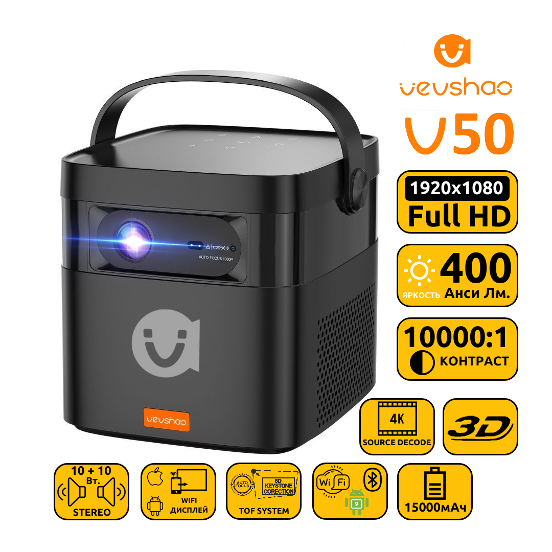 Проектор Byintek VevShao V50 - это портативный мультимедийный проектор, который обеспечивает высокое качество изображения благодаря технологии DLP и разрешению Full HD (1920x1080).
