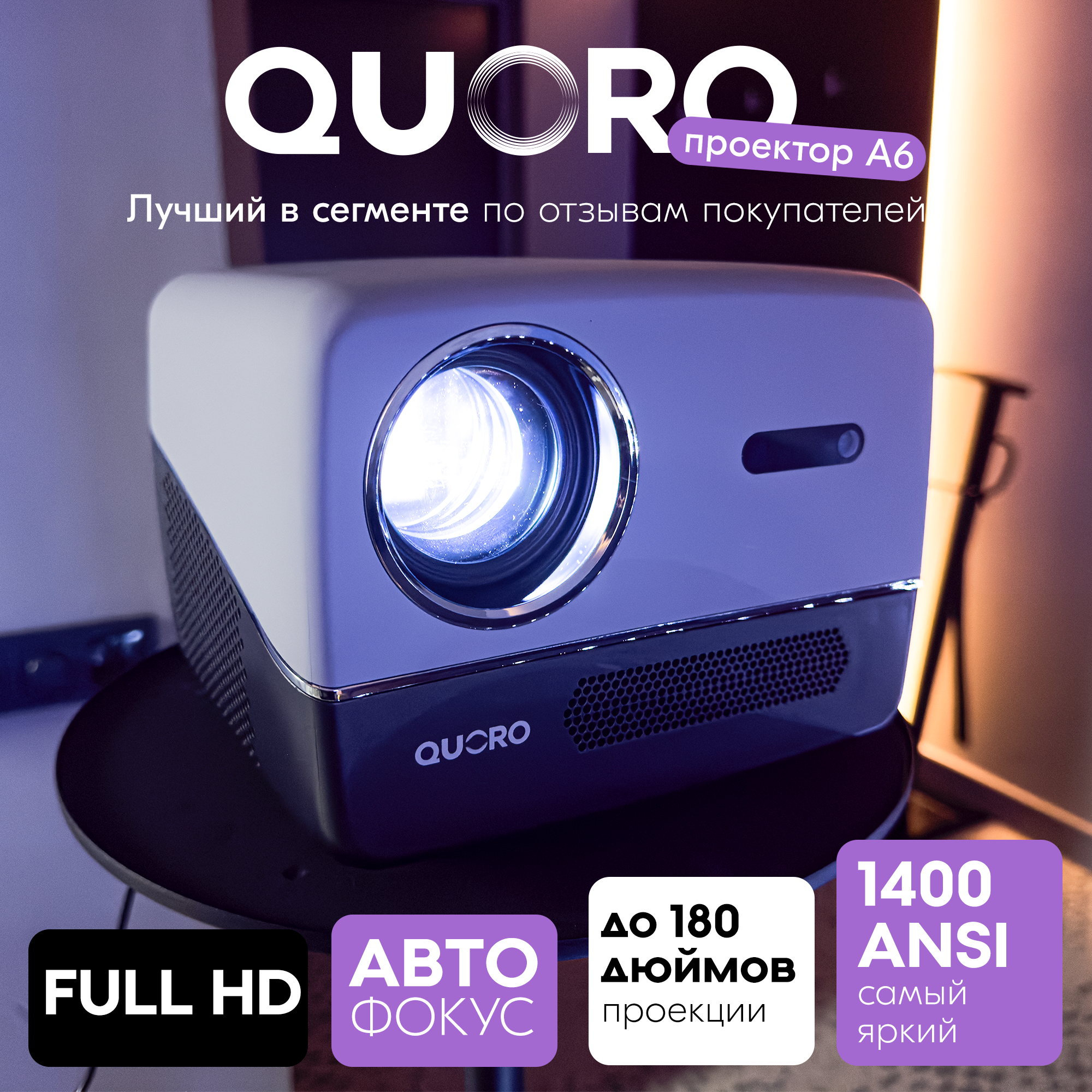 Купить Проектор для фильмов QUORO A6 1400 ANSI с функцией автофокуса Full HD с доставкой по всей России.