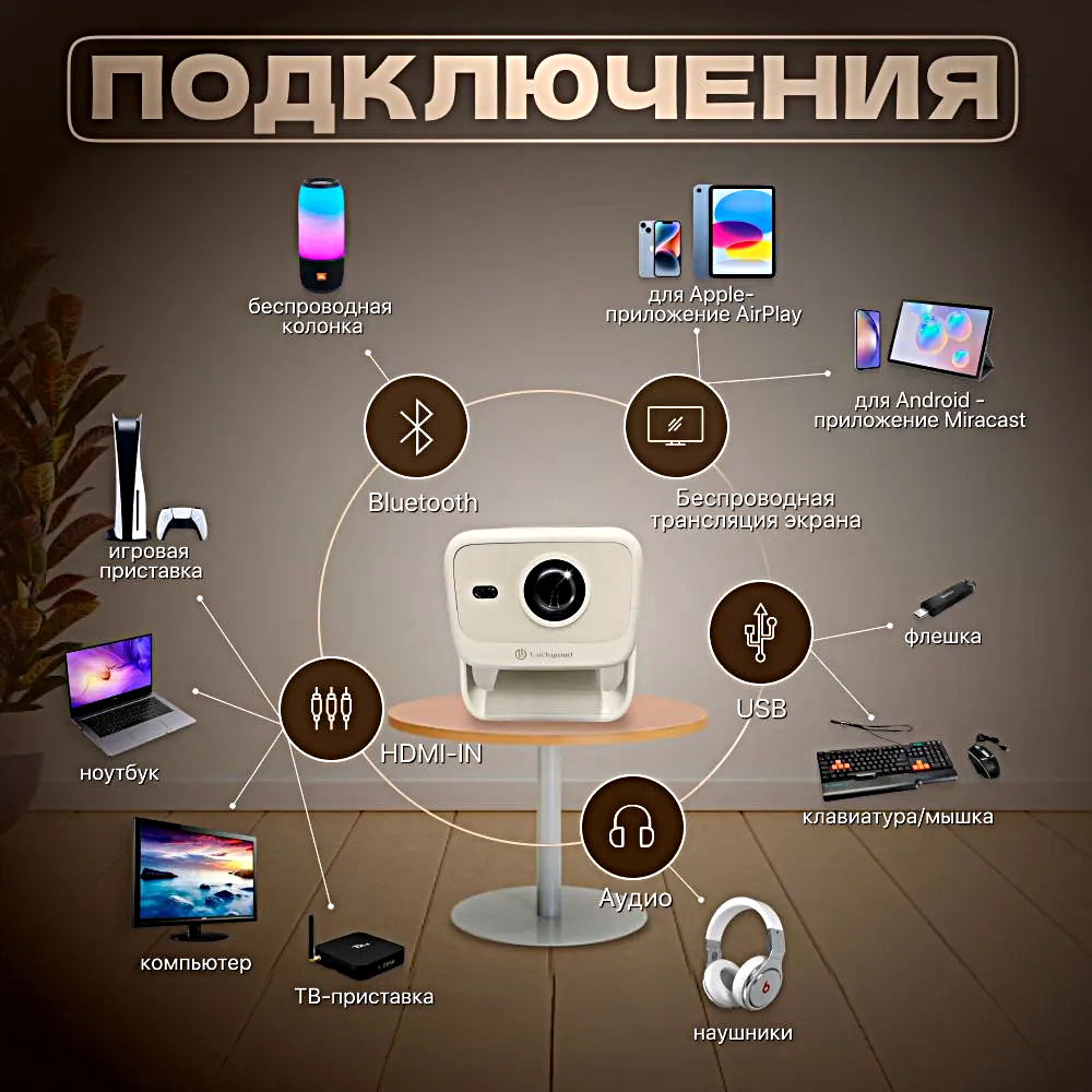 Компактный размер и портативность позволяют легко перемещать его из комнаты в комнату. Вы сможете настроить идеальный угол обзора, сидя на диване или лежа на кровати. Теперь можно создавать свой домашний кинотеатр в любой комнате и наслаждаться качественным изображением и звуком прямо у себя дома.