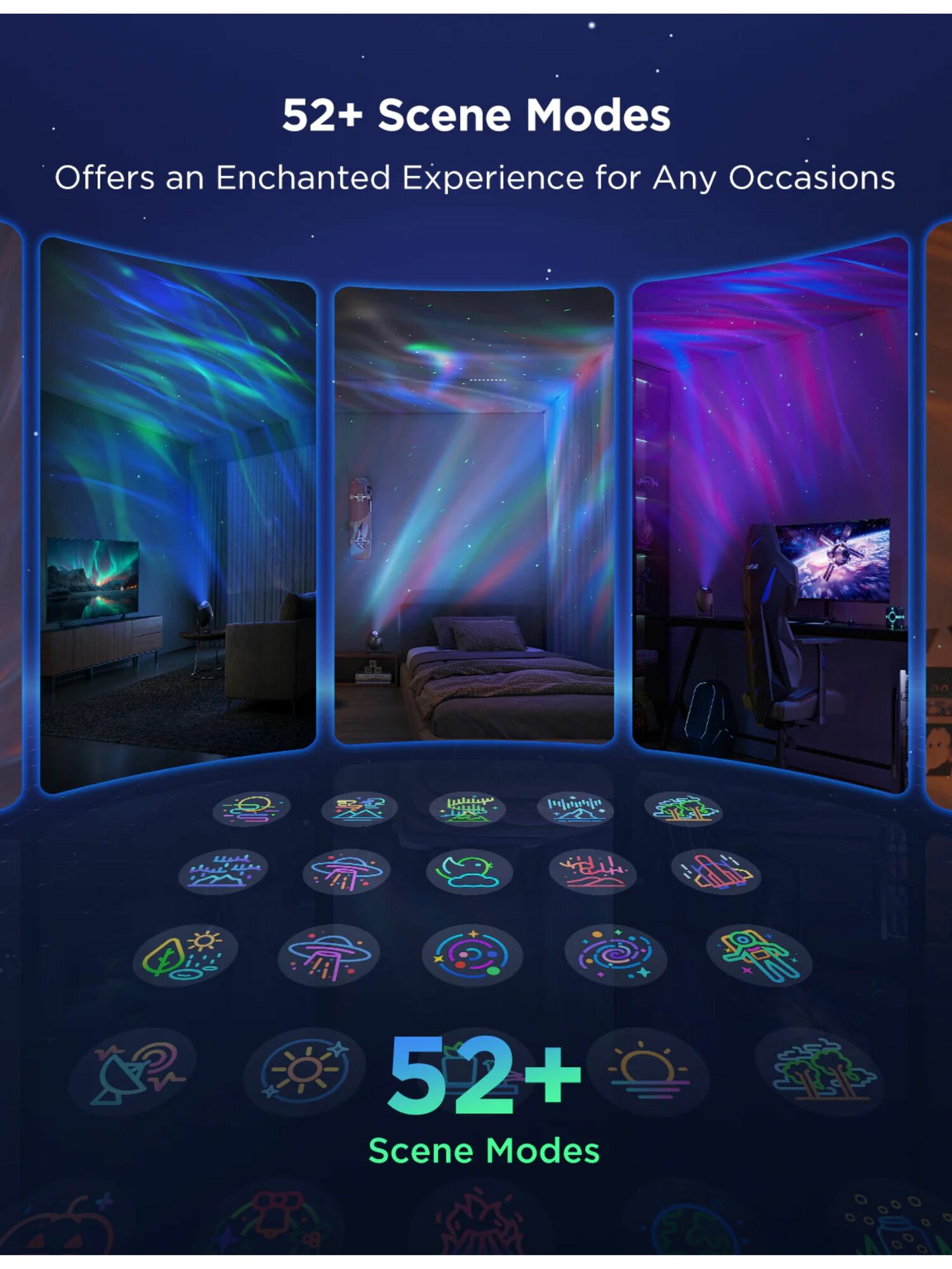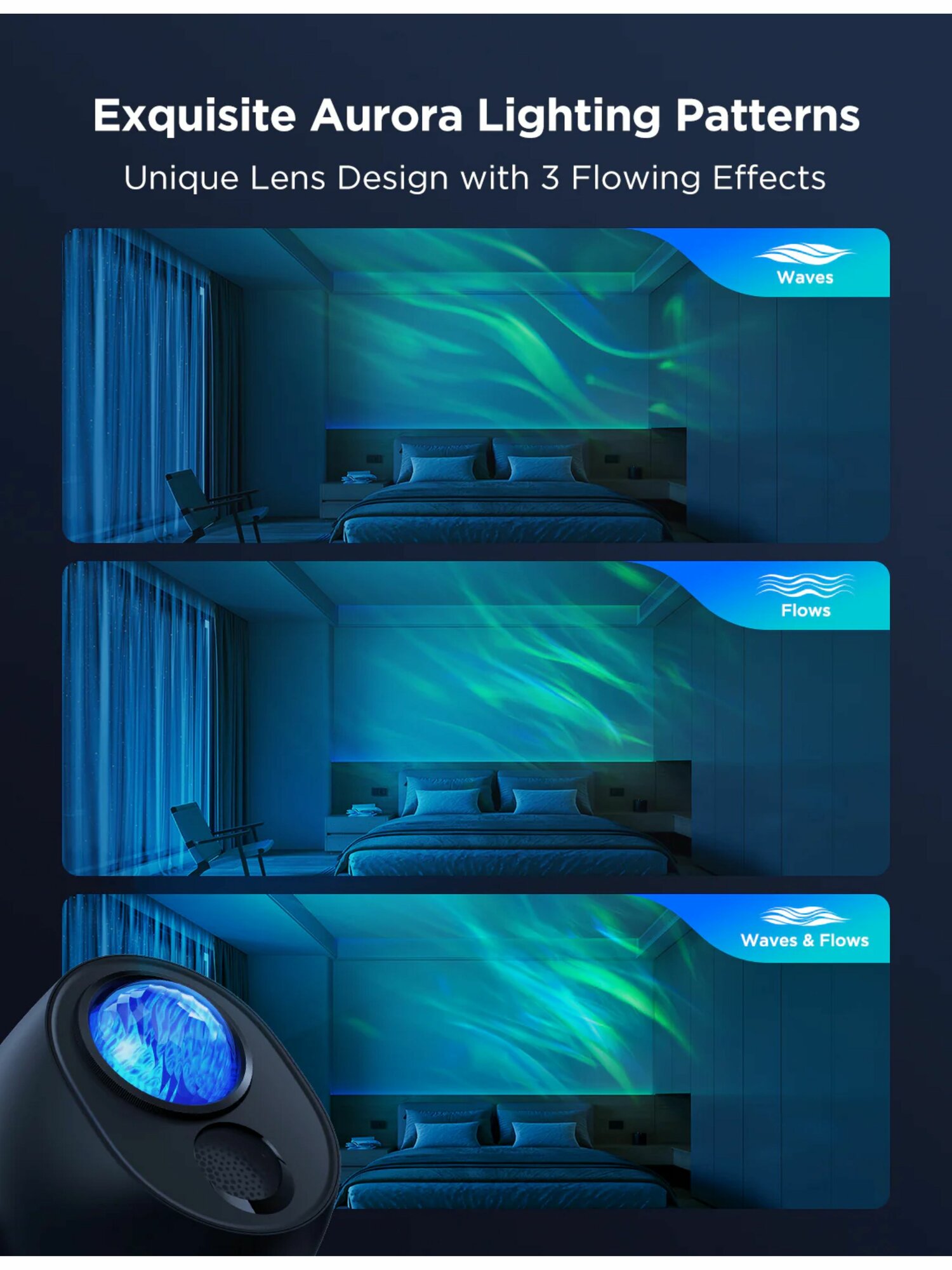Для максимальной персонализации предусмотрены гибкие настройки: можно регулировать яркость полярного сияния, цветовые комбинации, движение лазера, направление проекции и узоры.