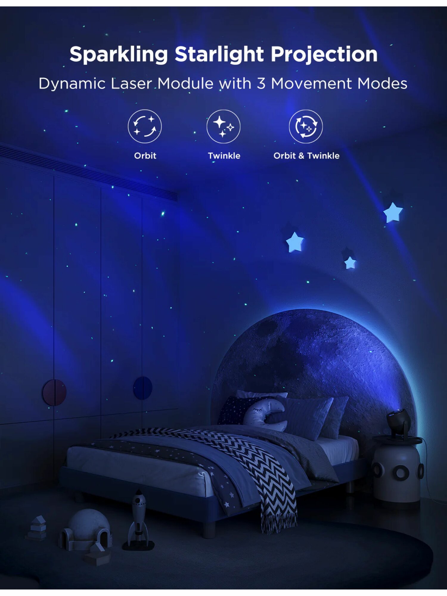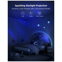 Проектор оснащен уникальной двойной лампой, которая обеспечивает эффектное освещение с проекционным пространством до 60 м². Благодаря эксклюзивной линзе, светильник создает сверхплавные звездные эффекты, а три различных стиля освещения позволяют выбрать подходящий вариант для любого настроения.