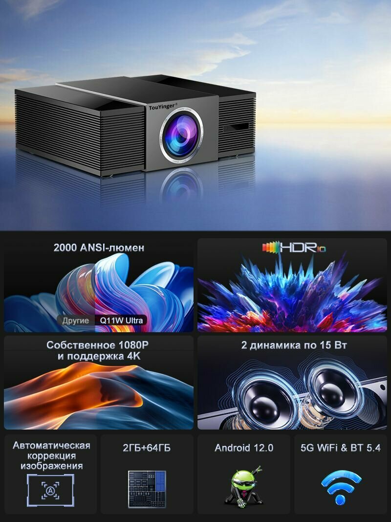 Проектор Touyinger Q11W Ultra - это идеальное решение для тех, кто хочет получить максимальное удовольствие от просмотра фильмов и игр дома. Этот проектор оснащен 1LCD-технологией, которая обеспечивает высокую яркость изображения и широкий диапазон цветов.