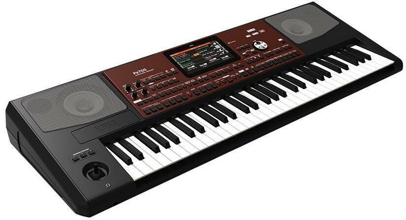 KORG PA700 - цифровая аранжировочная станция. Невзвешенная клавиатура насчитывает 61 клавишу, чувствительную к силе касания, функция Aftertouch отсутствует. Всего синтезатор имеет больше 1700 предустановленных звуков (512 пользовательских), включая этнические инструменты и аутентично воссозданные тембры фортепиано с резонансом корпуса и демпфером. Формирование звучания происходит с помощью мощного звукового генератора EDS-X с максимальной полифонией до 128 голосов. Можно подключить педали сустейна или экспрессии. Имеется 106 предустановленных наборов ударных и 256 пользовательских. Создавать и играть ритмы можно при помощи клавиш или же пэдов, которые располагаются на лицевой панели. 7-дюймовый сенсорный ЖК-дисплей с технологией TFT позволяет переключать пресеты, банки звуков, управлять эффектами и многое другое. Korg Pa700 позволяет установить на выбранный тембр по 2 эффекта из 148 встроенных. Для загрузки собственных сэмплов или композиций есть порт USB-A, а также слот для SD-карты. Текст в файлах для караоке может быть воспроизведен на внешнем мониторе, для подключения которого присутствует выход на разъеме RCA. Порт USB-B служит для коммутации с компьютером. Имеется MIDI-интерфейс с входом и выходом на стандартных 5-контактных разъемах. Для вывода звука предусмотрен линейный выход, линейный вход может использоваться для приема стереофонического сигнала, а также для подключения микрофона или электрогитары. Есть активная акустическая система с двумя широкополосными динамиками и двумя фазоинверторами для усиления НЧ-диапазона. Два усилителя обеспечивают общую мощность 50 Вт. Прибор выполнен в достаточно компактном облегченном корпусе, а в комплекте поставляется пюпитр. Питание осуществляется от сети.