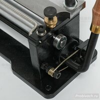 Это одна из самых удачных конструкций (тип А-806) из всех известных типов машинок для ручного двоения кожи. Ширина обрабатываемой полосы может достигать 100 мм. Надежный массивный нож с односторонней заточкой и толщиной 10 мм закреплен намертво на винтах и не может в процессе среза деформироваться и испортить обрабатываемую деталь. Нож можно править и точить. Поджимной валик на пружине прижимает полосу кожи к массивному валику из нержавеющей стали, который надежно зафиксирован без люфтов и вращается на подшипниках, благодаря этому угол подачи заготовки не зафиксирован и срез получается идеальным и стабильным по всей длине заготовки.