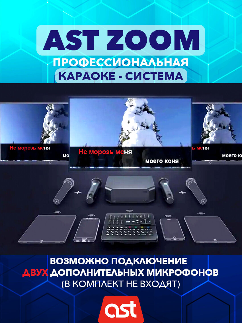 Караоке AST Zoom! Переработанный более компактный дизайн корпуса впишется в любой интерьер. Масса новых функций и возможностей удивит абсолютно любого, кто не может жить без пения в караоке! Не мало важно то, что вам не придется отдельно подбирать хорошие микрофоны, ведь в AST Zoom в комплекте уже идут 2 высококачественных радиомикрофона. AST Zoom: