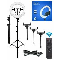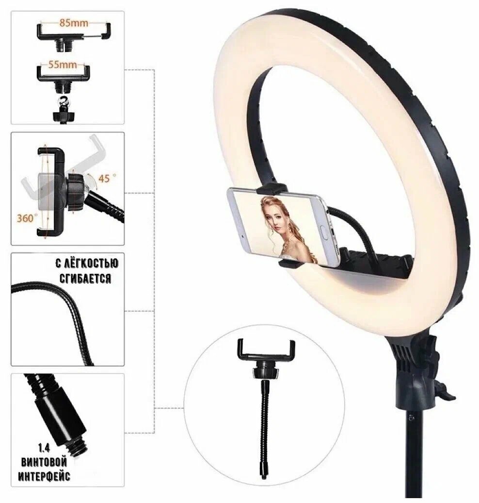 Профессиональная кольцевая светодиодная лампа LED лампа RL 14, диаметром 36 см с держателем для телефона напольным штативом и селфи пультом — для стилиста визажиста и селфи. Модель 123141