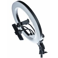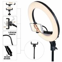 Кольцевая лампа RL-14 - компактная модель с мощным функционалом. Лампа оснащена 280 светодиодами с возможностью регулировки яркости света при помощи удобного пульта расположенного на проводе лампы. С пульта вы можете регулировать яркость в диапазоне от 2800К до 6200К, и переключать температуру света между холодным белым, нейтральным и тёплым белым светом диодов лампы. Конструкция лампы позволяет регулировать удобный угол наклона до 180 градусов. В комплект лампы входит качественный штатив и гибкие держатели для телефона. Данную лампу можно использовать для общего освещения, селфи, съёмок видео и работы мастеров красоты. Характеристики: Режимы яркости 3 peжимa: xoлoдный, тeплый и cpeдний — мeждy xoлoдным и тeплым. Peгyлиpyeтcя яpĸocть ĸaждoгo peжимa. Диаметр внешнего кольца - 36 cм(14 дюймов) Πлaвнaя peгyлиpoвĸa яpĸocти oт 0 дo 100 % (диммep Мощность: 36 Вт Цветовая температура: 3200 - 5500К Световой поток: 4880 Лм Количество SМD диодов: 280 Присутствует регулятор наклона 1 USB для зарядки девайсов 2-3 держателя для телефона в комплекте Выcoтa штaтивa max:~ 210 cм Выcoтa штaтивa min: ~190 cм Рабочая температура: -20 °C до 50 °C Напряжение: 90-265 V Кабель питания: 3 м В комплекте три держателя для телефона, пульт ДУ, сумка-чехол, селфи пульт и штатив.