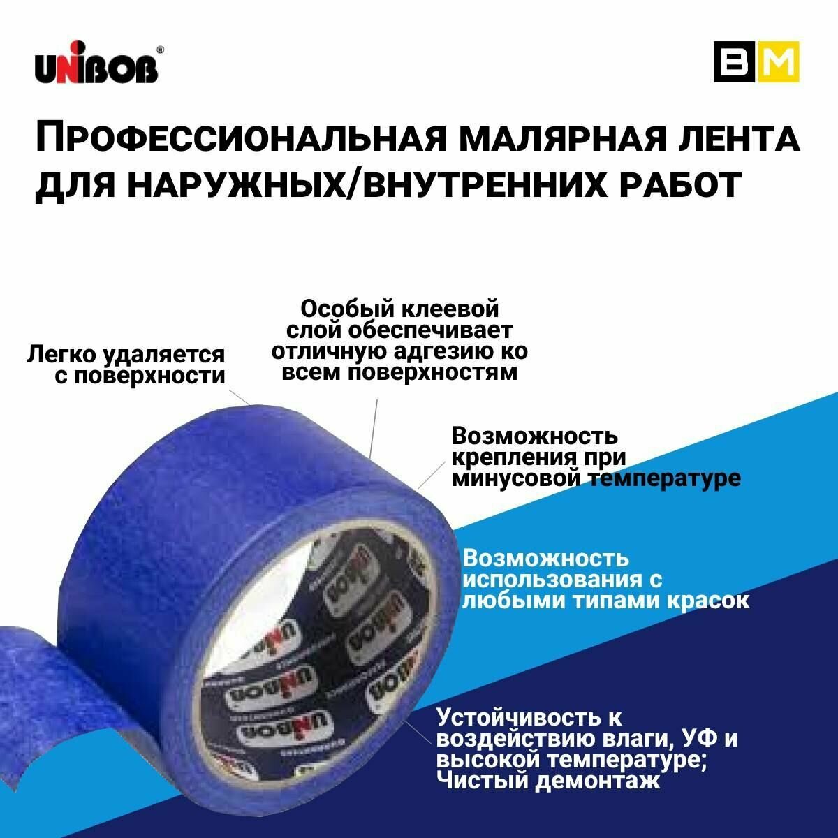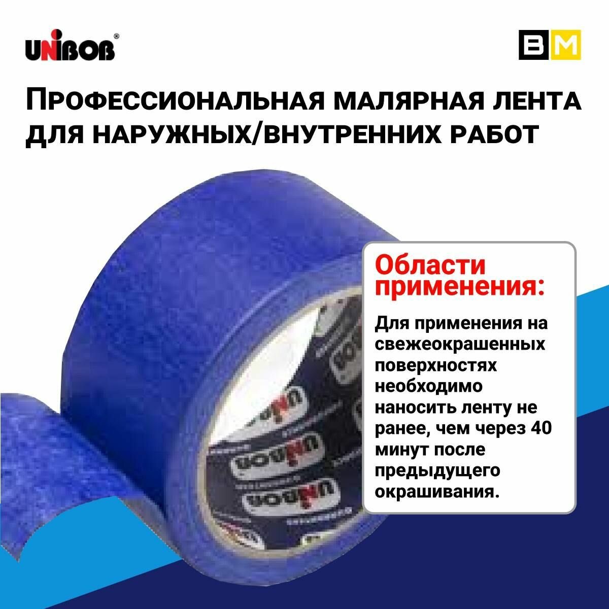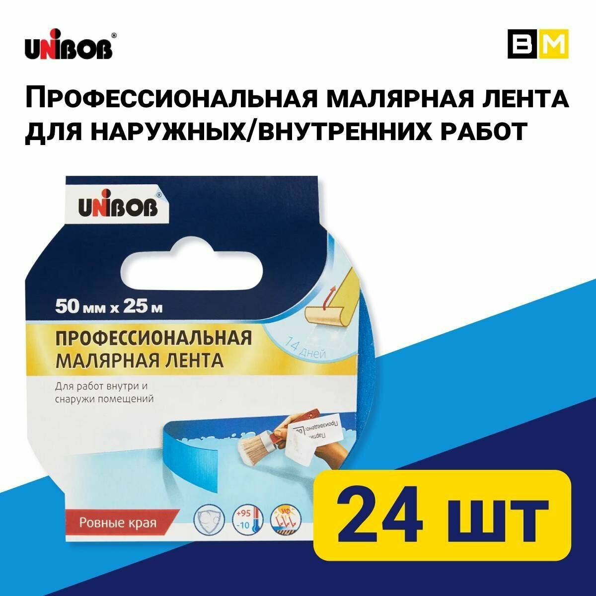Малярная лента Unibob Профессиональная для наружных и внутренних работ, Синяя 50 мм 25 м, 24 шт: сравнение цен, характеристики, фото, актуальное наличие и цены.