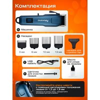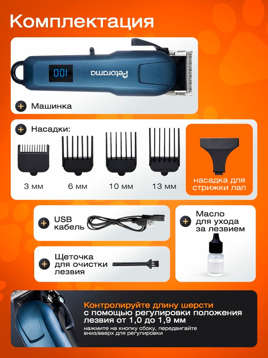 Машинка для стрижки животных - 1 шт Насадки - 4 шт Масло для ухода за лезвиями - 1 шт USB провод - 1 шт Щеточка - 1 шт