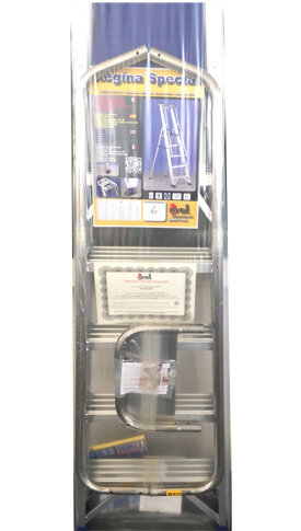 Лестница-стремянка Regina Special с поручнями и полкой 8 ступеней для профессионального использования.Противоскользящая рифлёная платформа из армированного полипропилена; Прочные ремни безопасности, предотвращающие случайное складывание;Большие,эргономичные, противоскользящие опорные наконечники из резины, обеспечивающие максимальную устойчивость лестницы;Лоток для инструментов на 10 кг.;Поручни с двух сторон устанавливаются снаружи лестницы, что увеличивает полезную ширину платформы и упрощает доступ рабочего.Усилительные распорки на первой ступени;Арматурные стержни на более длинных ступеняхУсиленная спинка от 8 ступенекНаличие этикеток и инструкции по использованию и обслуживанию;Полимерная упаковка с презентационным постером;Сертификат испытаний согласно европейским и итальянским нормативным требованиям ISO 9000 EN ISO 9606.технические характеристики Размер рабочей платформы: 28 см х 25,5 см; Ступени с противоскользящим покрытием глубиной: 8 см;Шаг ступеней: 25 см;Задняя часть с усилением (лестницы от 8 ступеней);Высота поручня безопасности: 60 см;Размер профиля передних стоек: 80 мм х 25 мм;Толщина в сложенном виде: 15 см.Максимальная нагрузка: 150 кг.