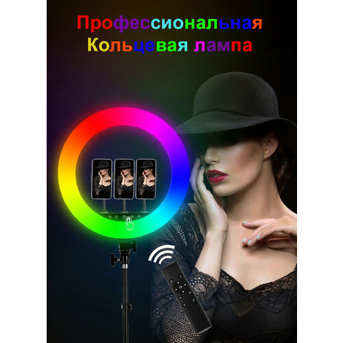 При необходимости Вы можете менять угол наклона лампы. Благодаря своей сборной конструкции лампа не занимает много места при ее хранении. В свободное от основной работы время, универсальная кольцевая лампа так же может служить прекрасным осветительным прибором, с регулируемой яркостью, температурой и направленностью свечения, создающий мягкий и комфортный для вашего зрения свет. Особенности: - Плавная регулировки яркости и температуры при помощи сенсорной панели или пульта - 3 вида стандартного температурного режима цвета: теплый, холодный, нейтральный, а так же большое кол-во RGB режимов, разные цвета и разные комбинации и эффекты - Поворачивается на 360 градусов во всех плоскостях - Можно менять интенсивность света, угол наклона штатива как вам нравится для удобного просмотра, фотографирования или съемки видео - В комплекте 3 держателя телефона на гибком креплении, которые подходят для смартфонов шириной до 7,5 см - Экономичные и энергоэффективные, питание от сети 220В - Отсутствие ультрафиолетового и инфракрасного излучения, низкое тепловыделение, безопасно для окружающей среды. - Срок службы диодов 10 лет (при повседневном использовании)