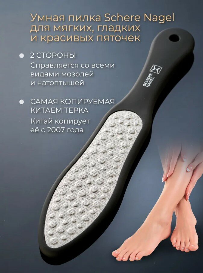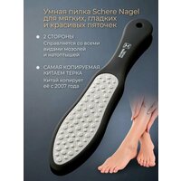 Мягкая кожа ног – работа лазерной тёрки Schere Nagel. Средство идеально подходит для обработки даже самых чувствительных стоп. Уникальное двухстороннее покрытие позволяет быстро и бережно удалить сухую огрубевшую кожу, не затрагивая и не перетирая при этом живую ткань, а также устранить микротрещины, которые провоцируют нарастание натоптышей.