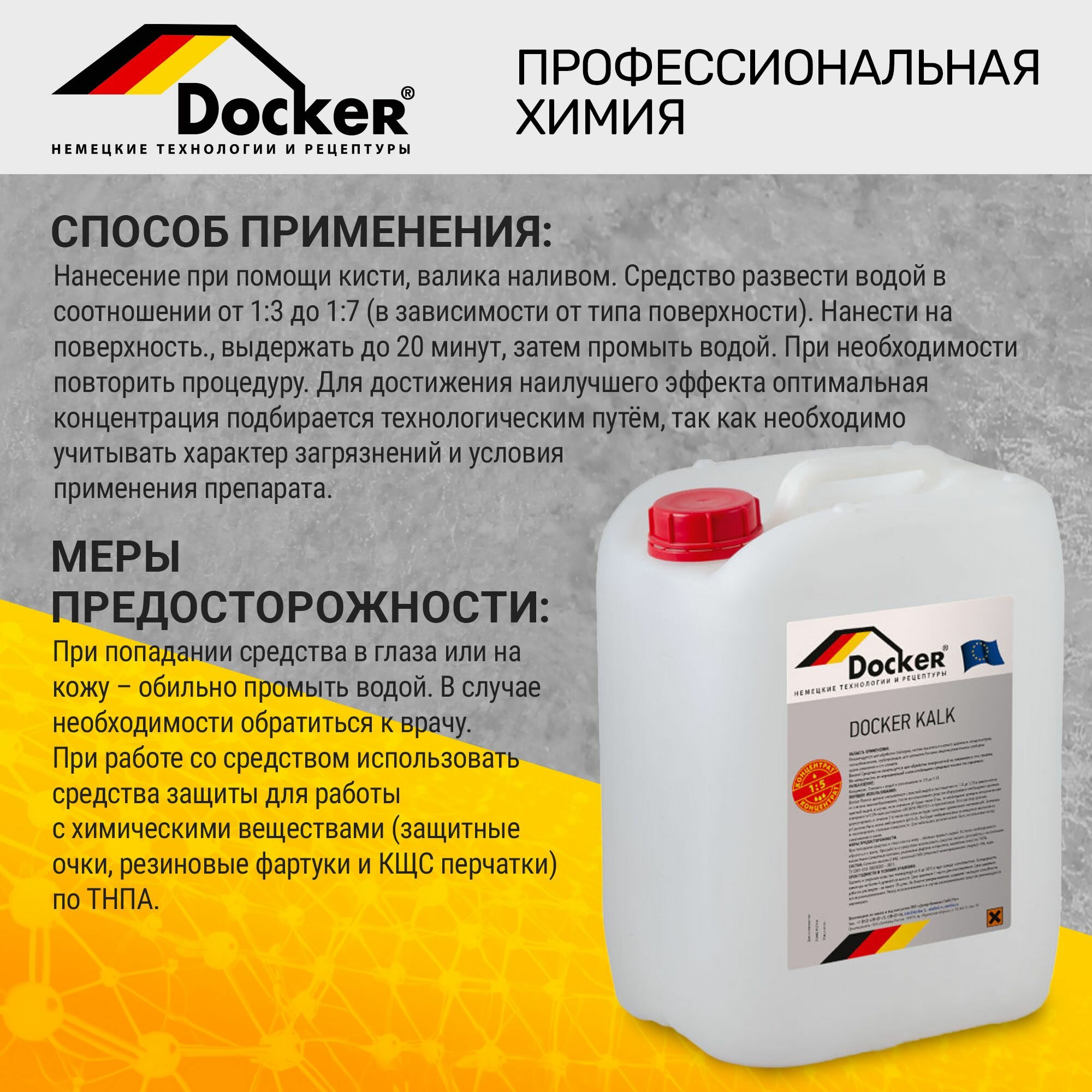 Профессиональное средство Docker Kalk 10 л, для очистки всех видов известковых наложений: сравнение цен, характеристики, фото, актуальное наличие и цены.