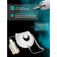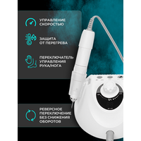 Аппарат обладает повышенной мощностью в 100 Вт, что обеспечивает стабильную и быструю работу. Скорость вращения достигает 45 тысяч оборотов в минуту, что позволяет быстро и эффективно обрабатывать ногти.