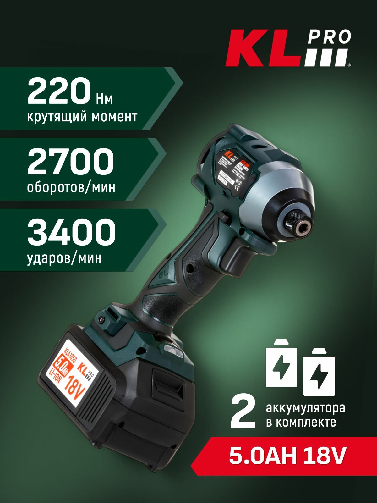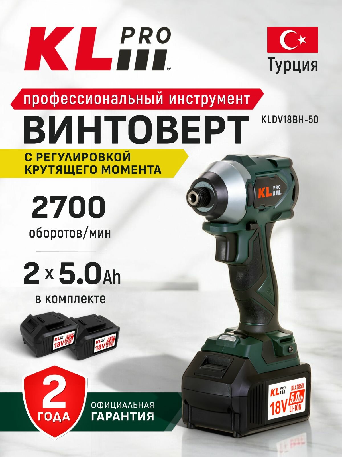 Купить Профессиональный бесщеточный винтоверт аккумуляторный KLPRO KLDV18BH-50 18 v / 5.0 ah 220 Hm с доставкой по всей России.