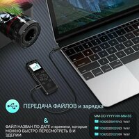 Можно производить запись во время прослушивания аудиофайлов, устройство поддерживает файлы в форматах FLAC, APE, MP3, WAV и т. д. Диктофон имеет таймер и 7 уровней шумоподавления, которые подойдут под любой случай записи. Питается от встроенного аккумулятора, которого достаточно для бесперебойной работы до 50 часов. Батарея 500 мАч.