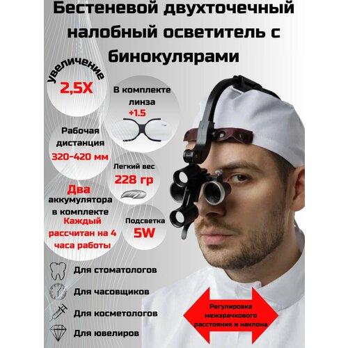 Налобный осветитель с двумя источниками света, бинокулярными лупами 2,5x и линзой +1,5, облегчают работу доктору и улучшают качество работы.