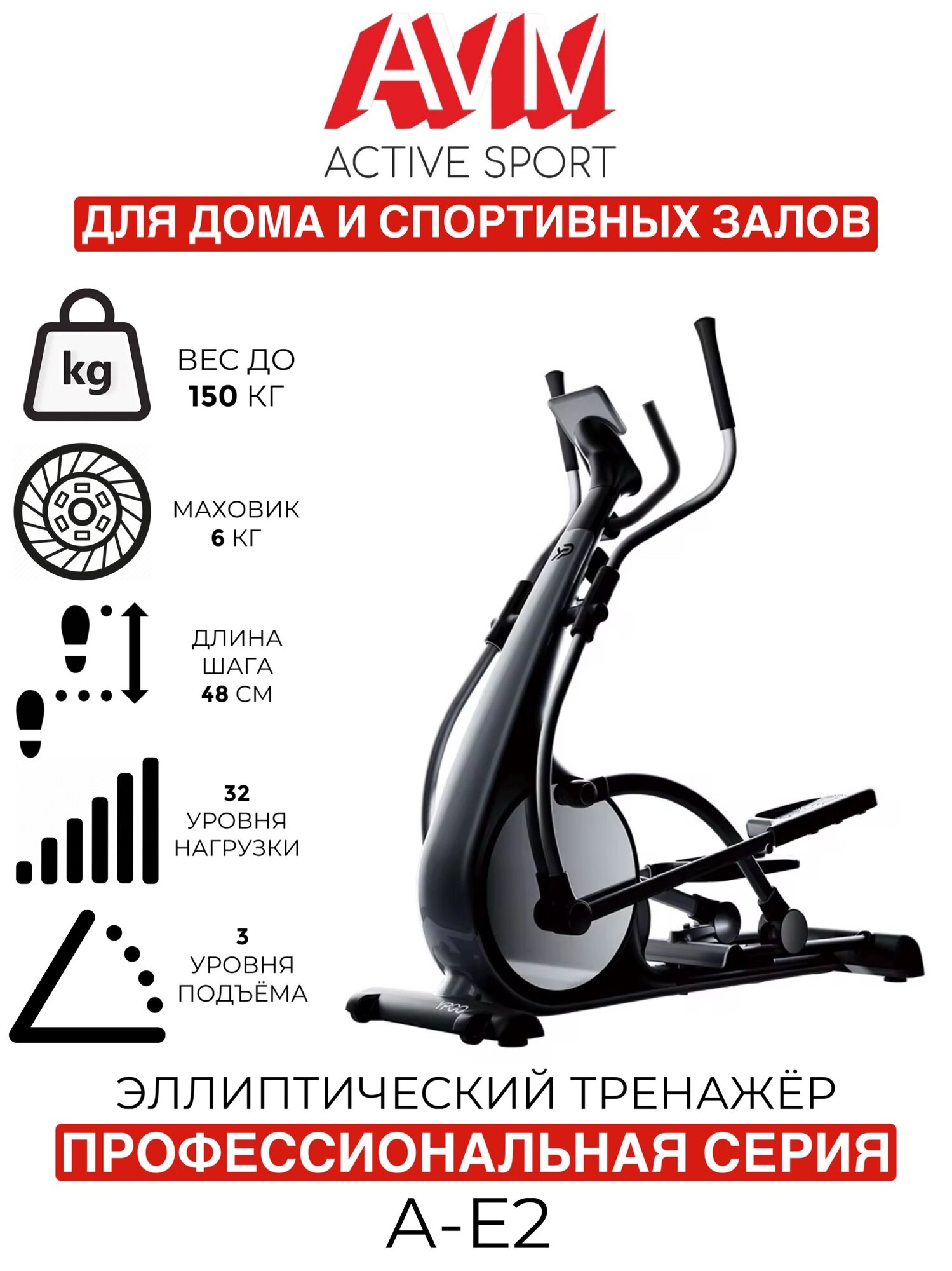 Профессиональный эллиптический тренажер AVM А-Е2 / Черный с хромом / До 150 кг / 32 уровня нагрузки / Длина шага 48 см: сравнение цен, характеристики, фото, актуальное наличие и цены.
