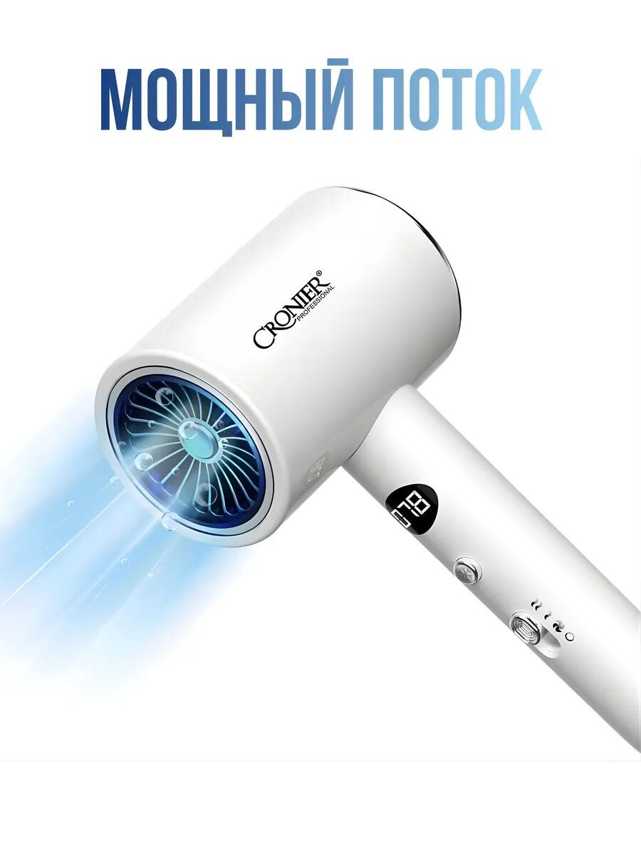 Борьба со статическим электричеством: Генератор выпускает поток отрицательных ионов, которые нейтрализуют положительный заряд, возникающий при трении. Это моментально снимает эффект «пушистости», делая волосы гладкими и послушными.