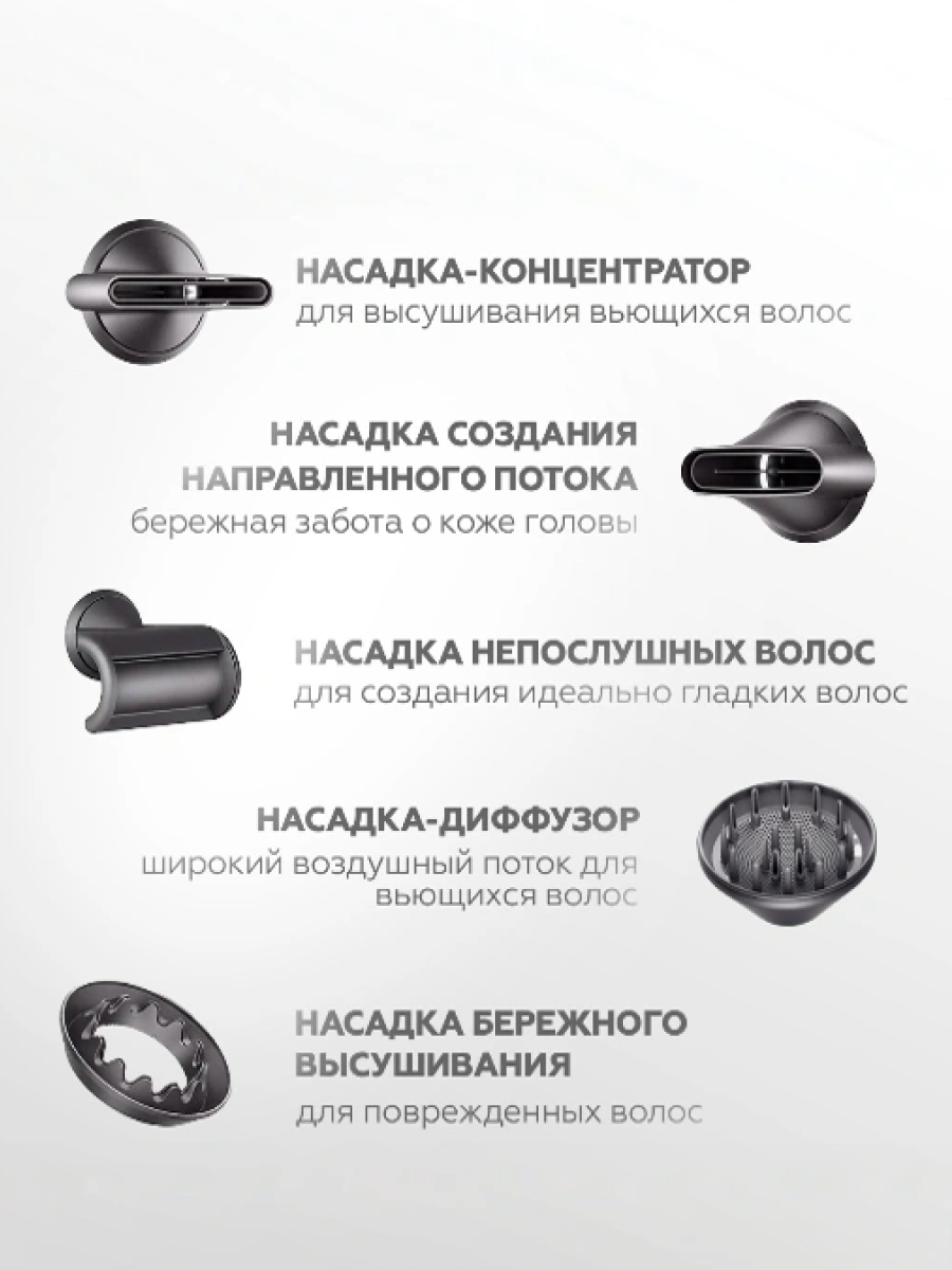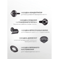 | Насадки | диффузор, для бережного высушивания, для выпрямления, для непослушных волос, концентратор |