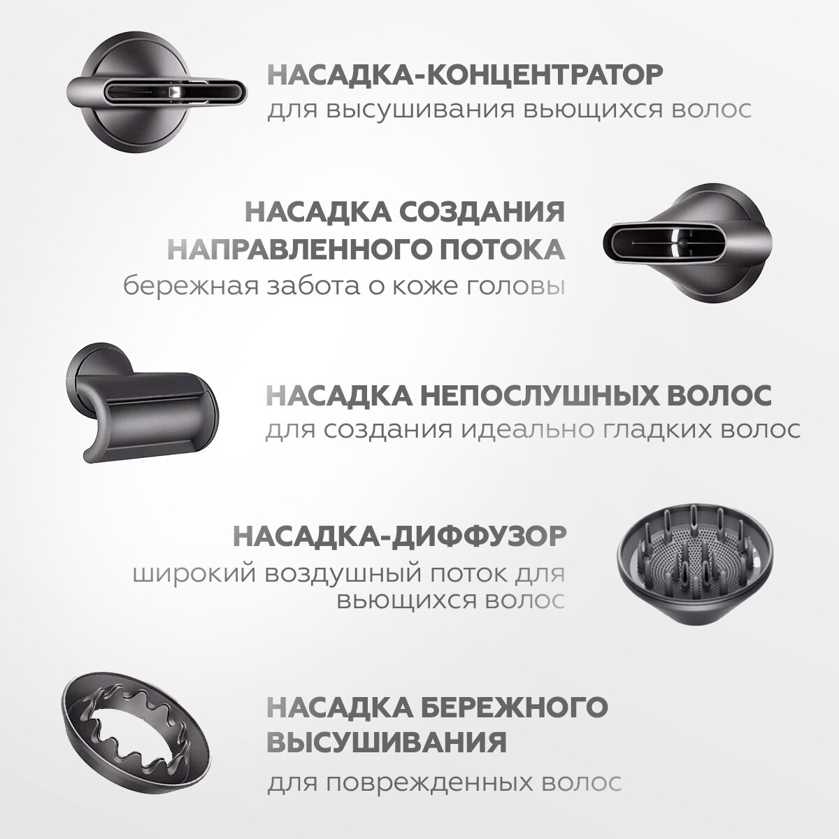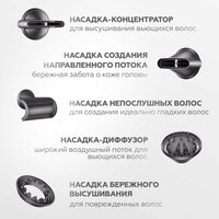 С тремя уровнями нагрева и четырьмя уровнями скорости, вы сможете настроить фен на оптимальные параметры для вашего типа волос и желаемого стиля. Комплектация включает 5 насадок: насадку-диффузор для создания объема, насадку для непослушных волос, насадку-концентратор для точной укладки, насадку для направленного потока и насадку для бережного высушивания.