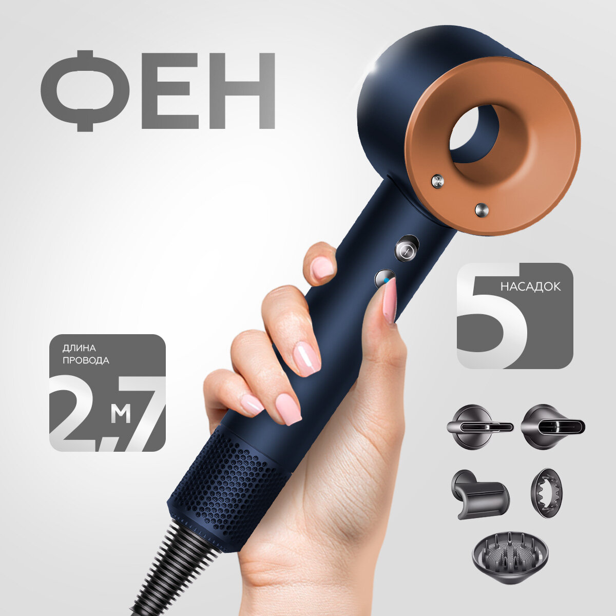 | Насадки | диффузор, для бережного высушивания, для выпрямления, для непослушных волос, концентратор |