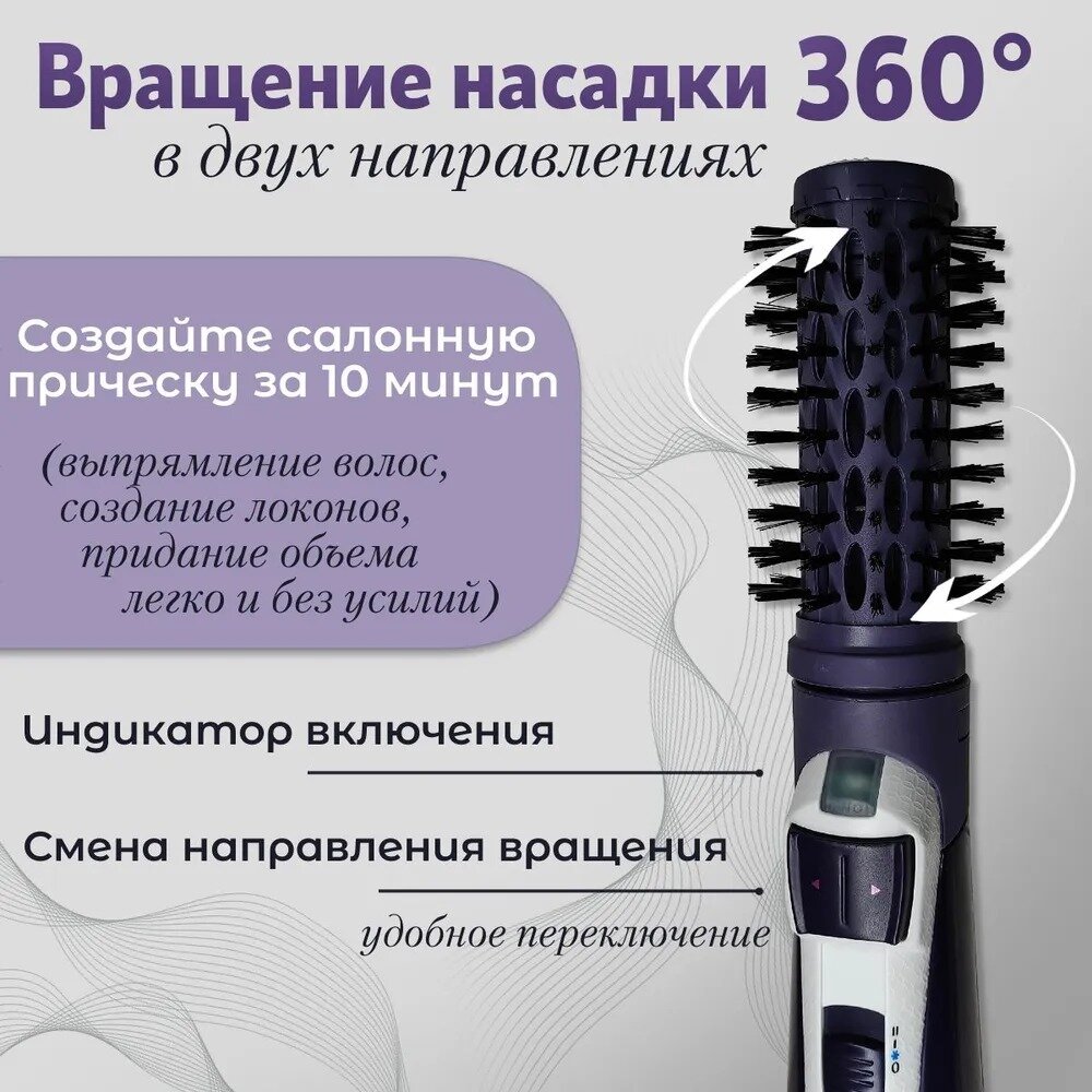 Фен-щетка для волос - это многофункциональный инструмент, который сочетает в себе функции фена и стайлера. Особенностью данной модели является автоматическое вращение насадки, что позволяет равномерно распределять тепло по всей поверхности волос. Это обеспечивает равномерное высушивание волос и предотвращает их перегрев. Фен оснащен двумя насадками: расческой и щеткой. Расческа с искусственными щетинками позволяет легко расчесывать волосы, а щетка с диаметром 50 мм обеспечивает эффективное удаление излишков влаги и укладку волос. Модель оснащена керамическим покрытием, которое обеспечивает равномерное распределение тепла и предотвращает пересушивание волос. Фен-щетка имеет три режима работы, два режима нагрева и одну скорость. Это позволяет подобрать оптимальный режим для любого типа волос и добиться желаемого результата. Фен оснащен функцией подачи холодного воздуха, которая позволяет закрепить укладку и сохранить ее на длительное время. Длина сетевого шнура составляет 2 метра, что обеспечивает свободу движений во время укладки. Фен-щетка имеет защиту от перегрева, что делает его использование безопасным и комфортным. Фен-щетка поставляется без чехла, что позволяет вам выбрать наиболее подходящий для вас вариант. Фен-щетка для волос - это надежный и функциональный инструмент для создания стильных и красивых причесок.