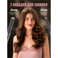 Пластиковый короб, фен, насадка-стайлер 40 мм, насадка-стайлер 30 мм, насадка-концентратор, насадка-фен, насадка-расческа для разглаживания, инструкция, сумка для хранения, гарантийный талон