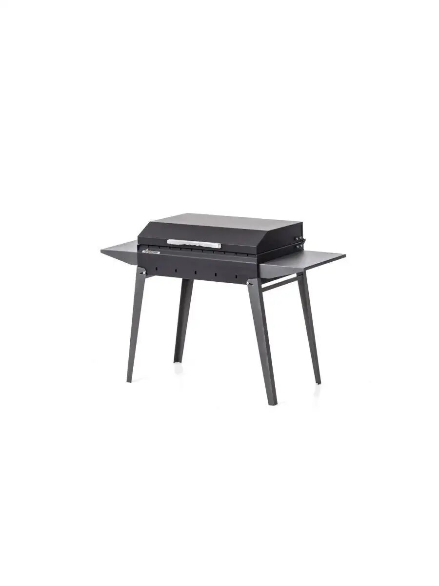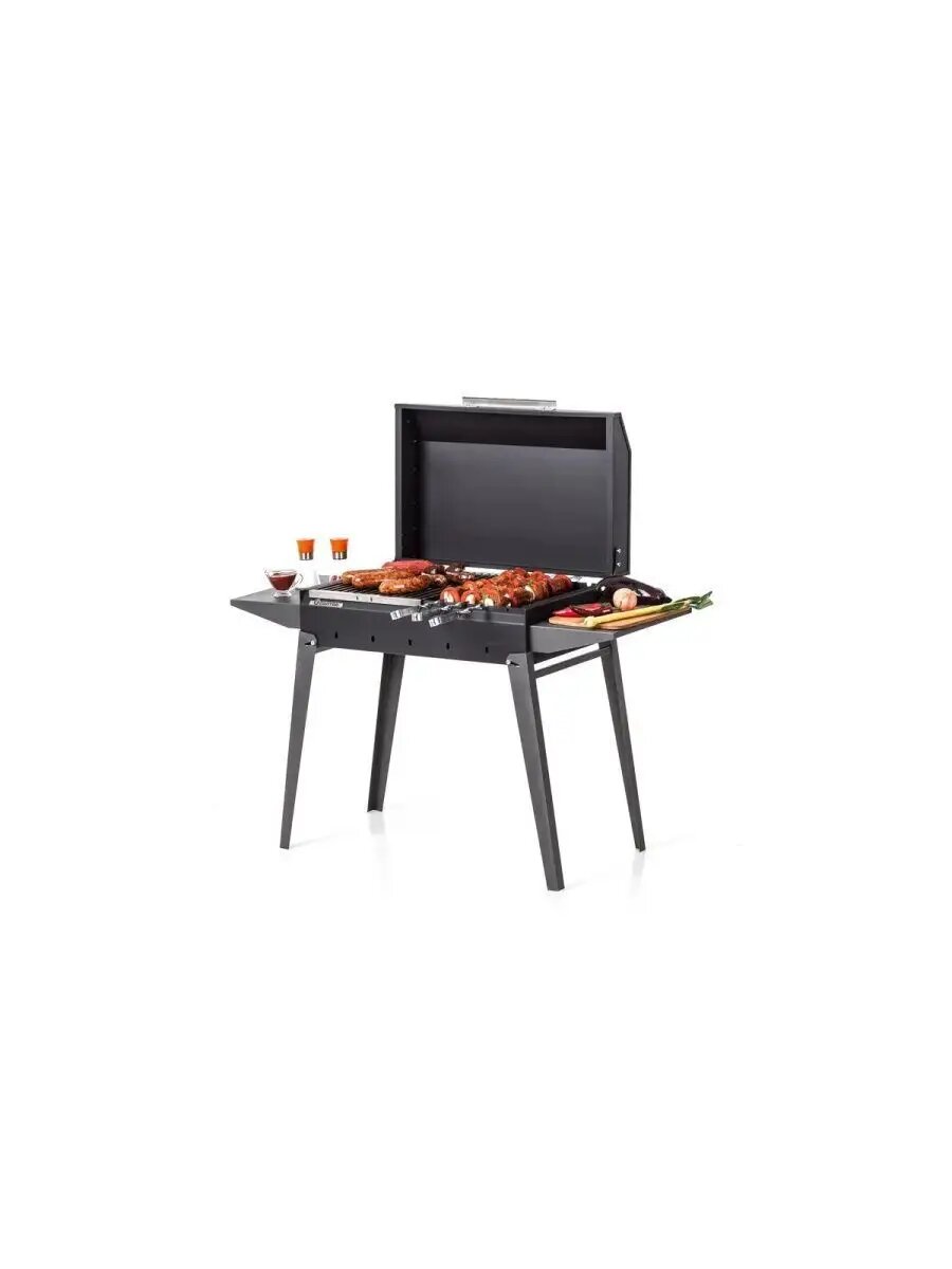 Ключевые преимущества: • Универсальность - подходит для приготовления различных блюд • Мобильность - легко помещается в багажник автомобиля • Компактность - складные ножки для удобного хранения • Функциональность - боковая полка для удобства готовки • Надежность - усиленная конструкция из толстой стали • Многозадачность - возможность копчения продуктов • Универсальность использования (дрова/уголь)