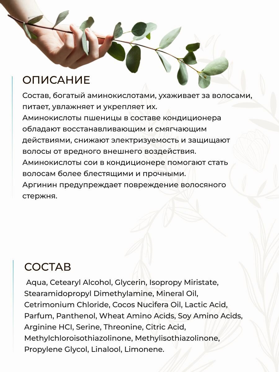 Профессиональный кондиционер для волос, подходящий для всех типов волос: окрашенных, поврежденных, кудрявых, истонченных и потерявших объем волос. Увлажняющий кондиционер для волос с аминокомплексом в составе сохраняет блеск волос, пролонгирует эффект, увлажняет волосы и борется с электризацией и тусклостью. Подойдет для домашнего использования. Состав, богатый аминокислотами, ухаживает за волосами, питает, увлажняет и укрепляет их. Кондиционер для кудрявых волос восстанавливает волосы и сохраняет объем. Аминокислоты пшеницы в составе лучшего кондиционера обладают восстанавливающим и смягчающим действиями, снижают электризуемость, препятствуют излишнему испарению влаги и защищают волосы от вредного внешнего воздействия. Аминокислоты Сои повышают способность волоса удерживать влагу внутри себя, оставаясь более увлажненным. Аргинин предупреждает повреждение волосяного стержня. Можно использовать для домашнего ухода. Для достижения максимального эффекта рекомендовано использовать в сочетании с шампунем Tashe professional Salon care Преимущества: приятный запах, подходит для всех типов волос, эффективно питает, увлажняет и укрепляет волосы. Инструкция: 1. Равномерно нанесите кондиционер на влажные волосы. 2. Оставьте на 1-2 минуты. 3. Тщательно смойте теплой водой.