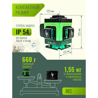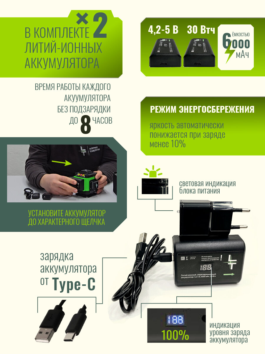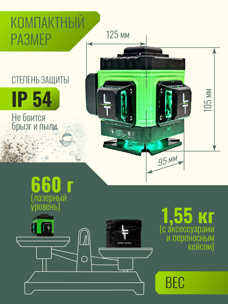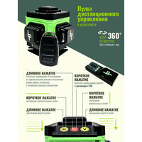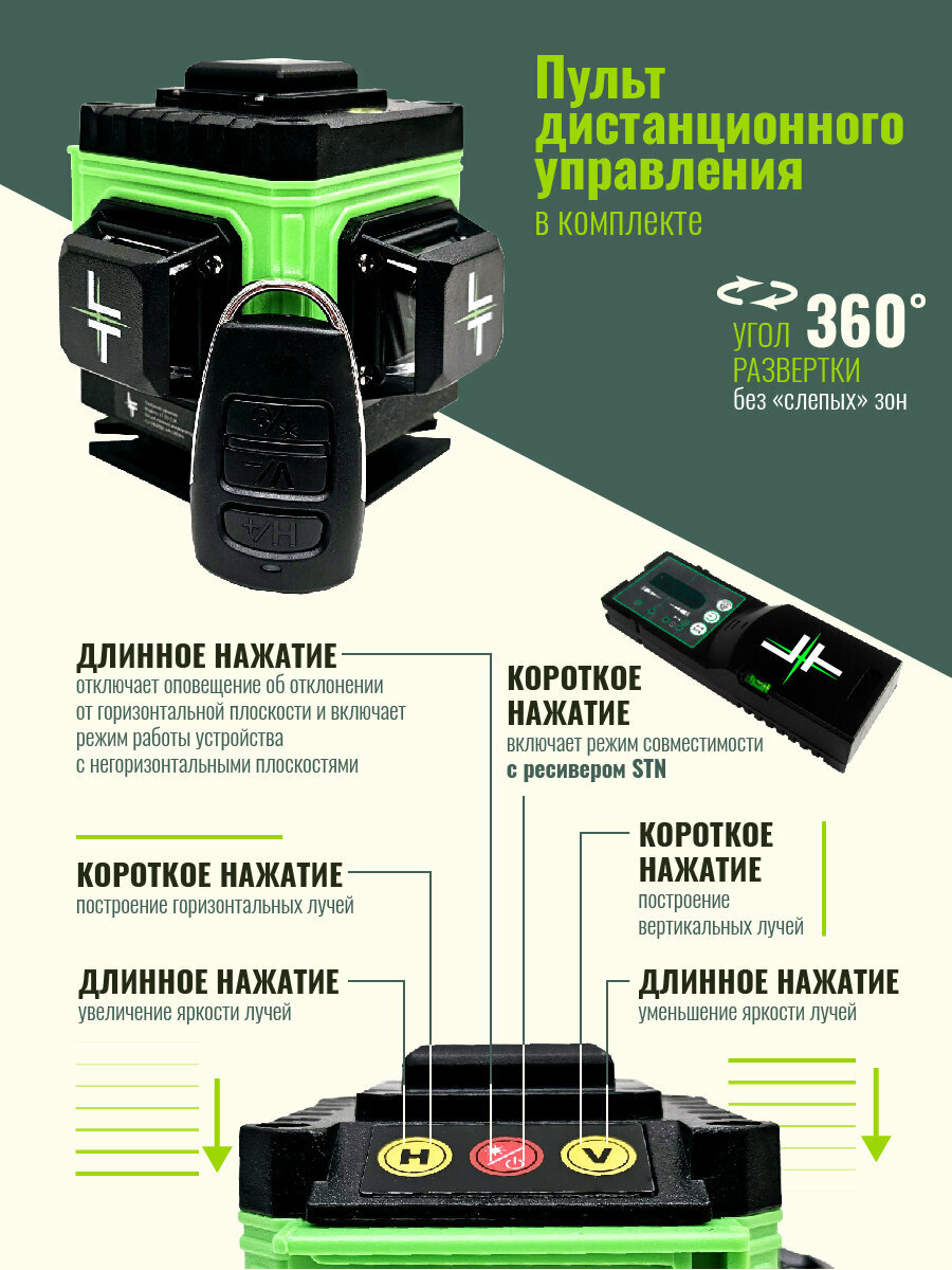 Представляем вам новую модель построителя лазерных плоскостей LT серии А 12 линий 360 градусов с японскими светодиодами SHARP. Уровень выстраивает 3 плоскости в 360 градусов (в круговую): - 2 вертикальные плоскости 360 градусов с пересечением под прямым углом 90 градусов-.1 горизонтальная линии 360 градусов снизу уровня. Нижний горизонт идеально подходит для работ по заливки полов и стяжки. Работает от Аккумулятор литий-ионный Li-Ion 6000 Мач (в комплекте идёт одна батарея) с зарядным устройством. Зарядное устройство USB. Наши устройства можно заряжать во время эксплуатации как от блока питания, так и от power bank. Особенности: - До 8 часов работы при постоянном свечение луча. - Лучи включаются как с сенсорных кнопок на корпусе устройства, так и с пульта дистанционного управления. - Зеленый цвет луча лучше виден на свету и менее вреден для глаз. Дальность до 50 метров (в зависимости от освещения). При помощи приемника (отражателя) лазерных лучей (приобретается отдельно) можно работать в солнечную погоду. - Противоударная и влагозащитная сумка для переноски устройства. Все наши уровни проходят трехступенчатый контроль проверки качества сборки на заводе-производителе и инспекционный контроль приемки товара. Калибровка устройств производится на заводе с помощью специального оборудования, сертифицированного по международным стандартам и только специалистами самого высокого уровня допуска. Дополнительно, мы самостоятельно проверяем каждое устройство перед отправкой нашим покупателям. Мы даем 100% гарантию на ровность вертикалей и горизонталей. Внимание! Цвет аксессуаров может отличаться от фото! Комплектация: 1. Профессиональный лазерный уровень с двумя вертикальными и одним горизонтальным лучом в 360 градусов (Вкруговую).2. Аккумулятор литий-ионный Li-Ion 1 штука 6000 мач. с индикатором заряда.4. Противоударная транспортировочная сумка. 5 Зарядное устройство USB. Пульт дистанционного управления. Руководство по эксплуатации изделия и условия гарантийных обязательств, гарантийный талон.