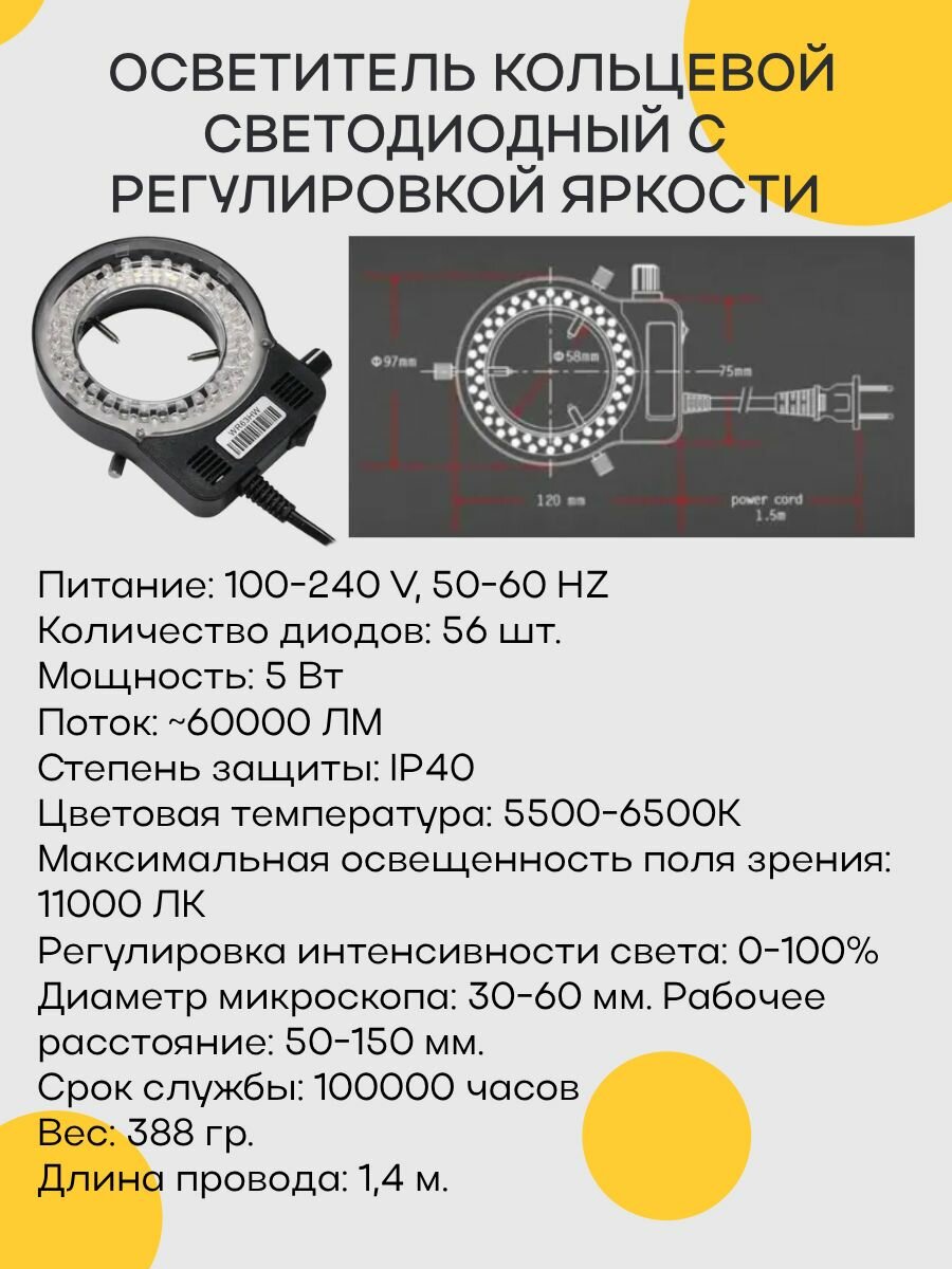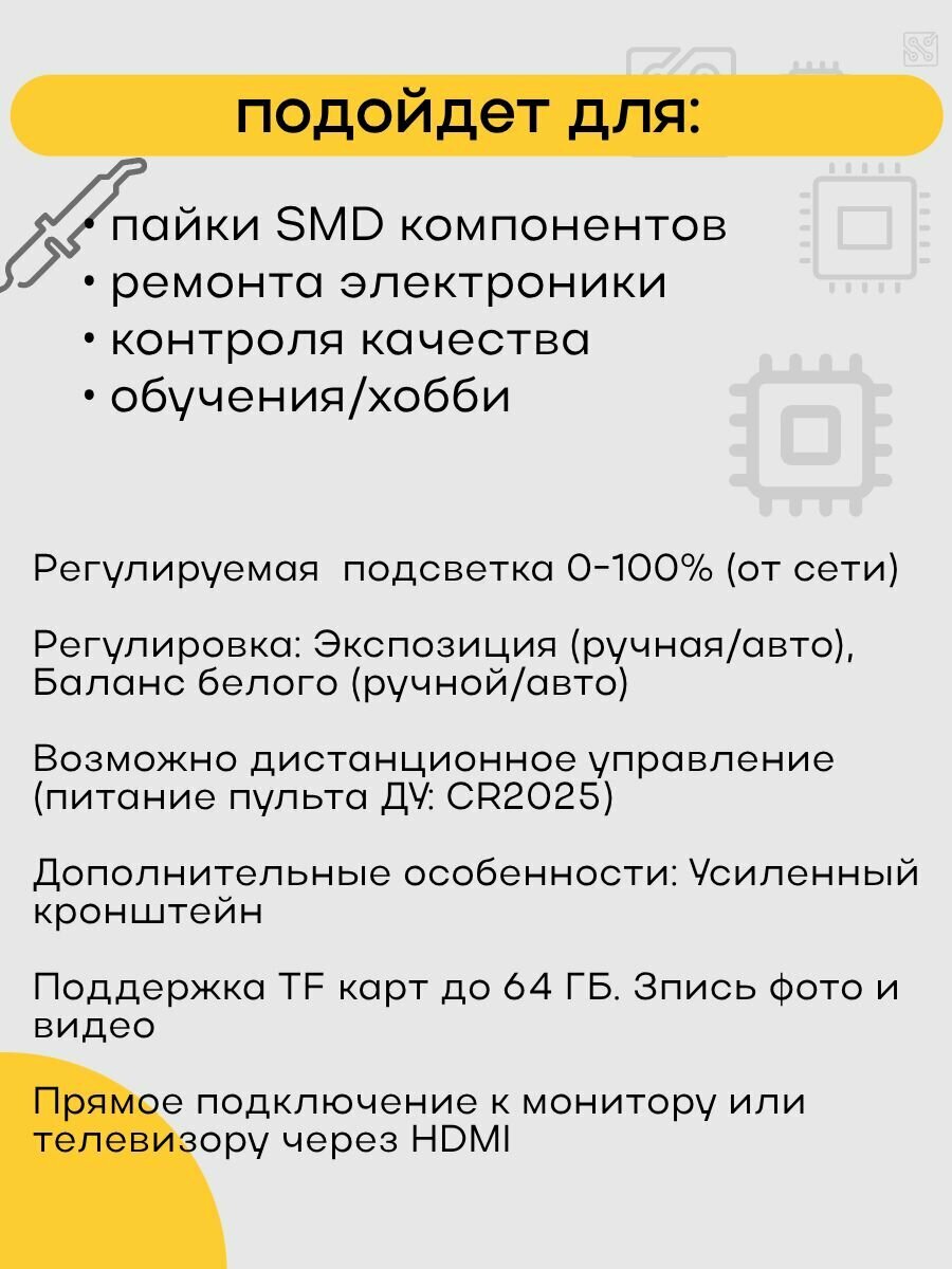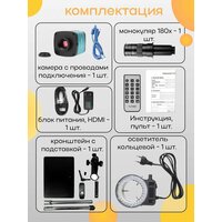 | Подробная комплектация | Комплектация камера с проводами подключения - 1 шт., монокуляр - 1 шт., осветитель кольцевой - 1 шт., кронштейн с подставкой - 1 шт., блок питания - 1 шт. |