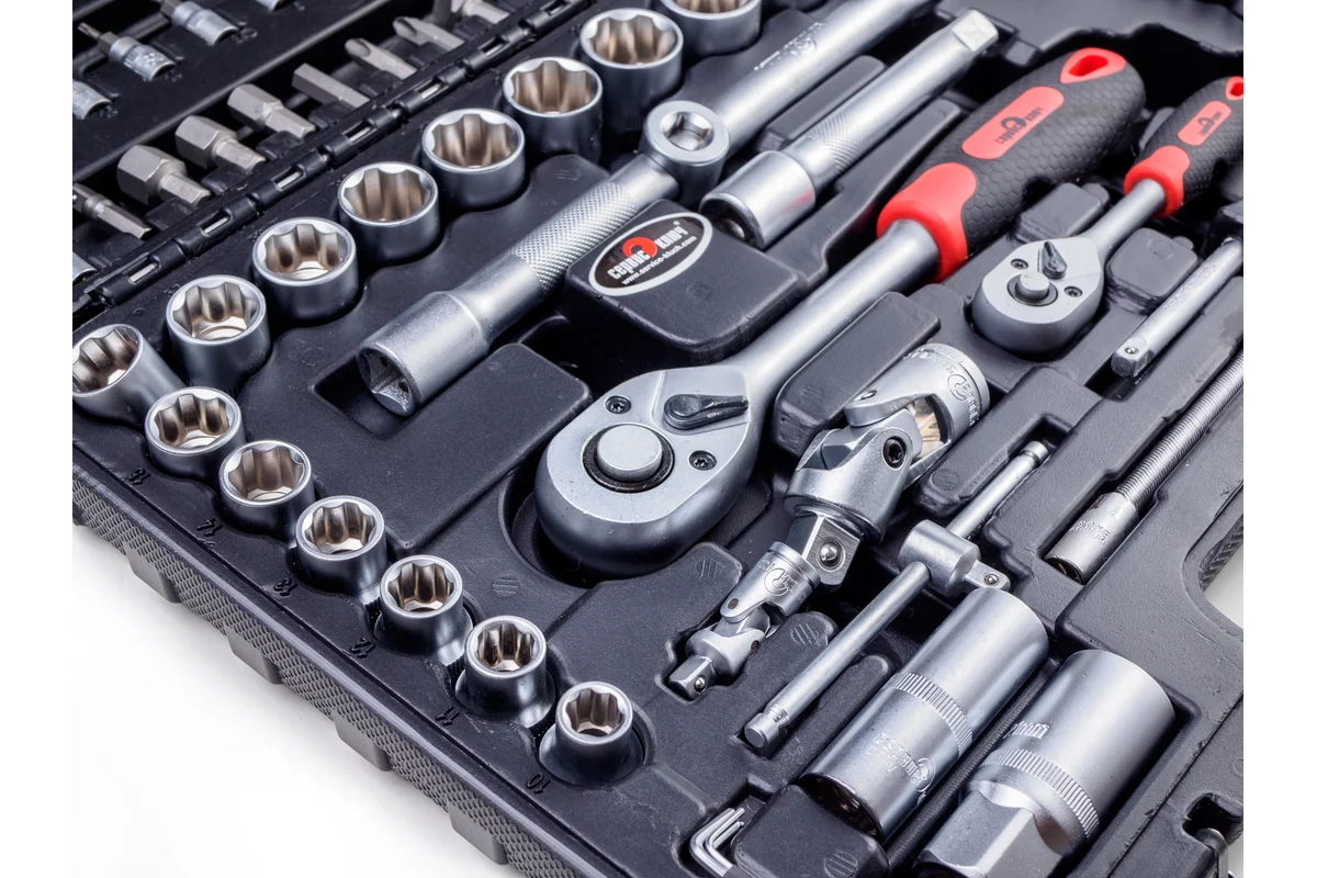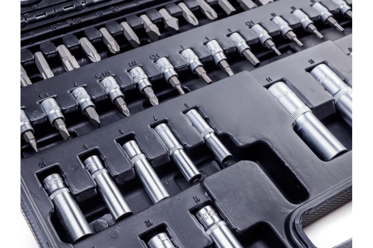 | Головки торцевые подробно | 1/4": 4, 4.5, 5, 5.5, 6, 7, 8, 9, 10, 11, 12, 13, 14 мм; с битами 1/4": H3, H4, H5, H6, SL4, SL5.5, SL7, Т8, Т10, Т15, Т20, Т25, Т30, PH1, PH2, PZ1, PZ2; трещетка 1/4"; удлинитель 1/4": 50, 100 мм; карданный шарнир 1/4"; гибкий удлинитель 1/4"; 1/2": 14, 15, 16, 17, 18, 19, 20, 22, 24, 27, 30, 32 мм; трещетка 1/2"; карданный шарнир 1/2"; удлинитель 1/2": 125, 250 мм; свечные 1/2": 16, 21 мм |