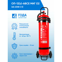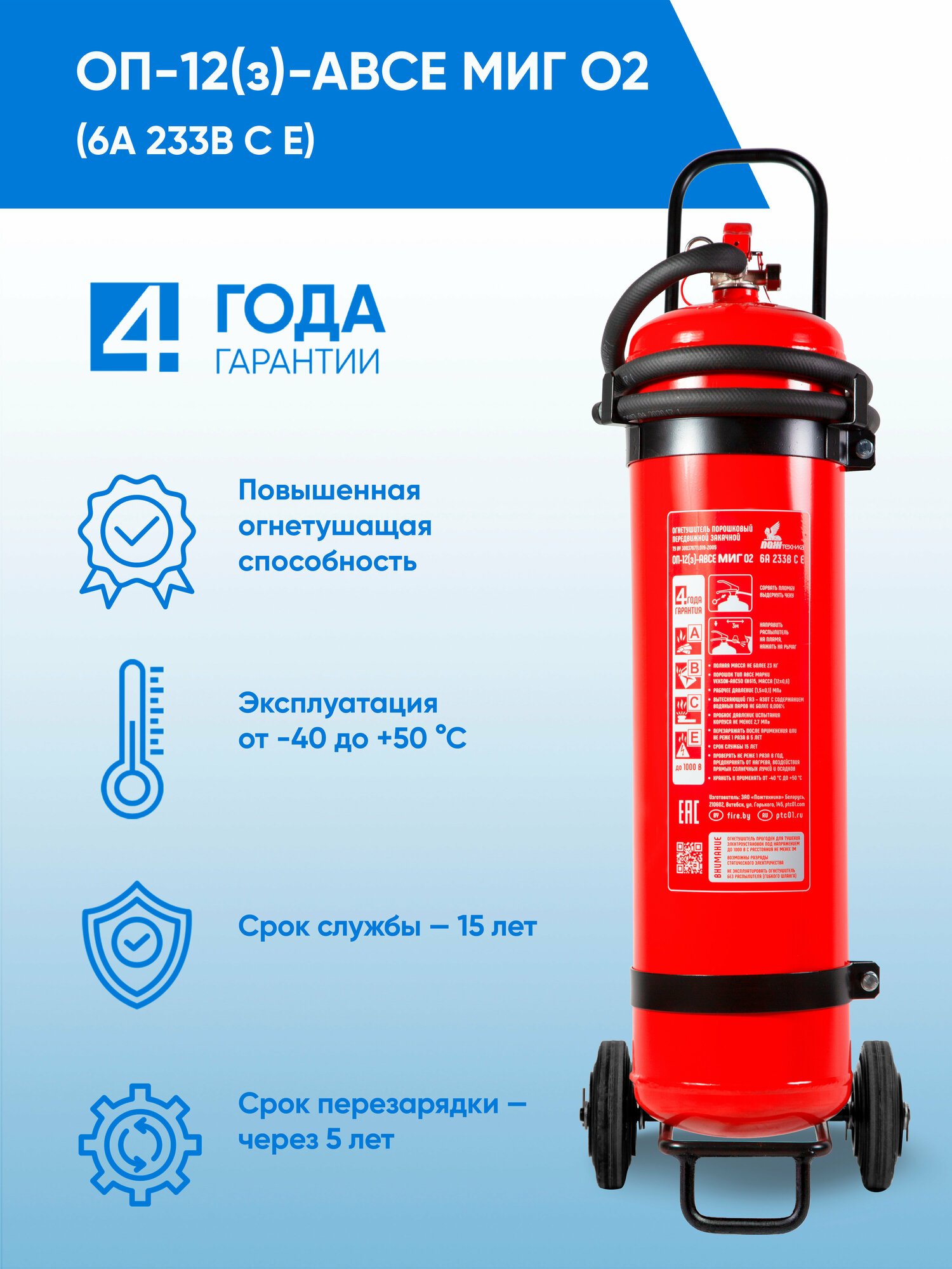 Огнетушитель порошковый ОП-12 (з) 'Миг' АВСЕ — малогабаритный передвижной порошковый огнетушитель с повышенной огнетушащей способностью. Передвижной огнетушитель 'Миг' имеет полимерное покрытие корпуса, устойчивое к ультрафиолетовому излучению, а также распылитель из морозостойкого, бензомаслостойкого резинового рукава длиной 3 м. Оснащен эргономичной съемной тележкой с обрезиненными колесами диаметром 200 мм, что обеспечивает удобство при перекатывании тяжелого огнетушителя. Кроме того, при ремонте тележки нет необходимости сдавать в ремонт огнетушитель в лицензируемую организацию, достаточно отсоединить тележку и отремонтировать ее отдельно, после чего самостоятельно вновь установить на нее огнетушитель. Предназначен для защиты производственных и складских помещений, а также автозаправок. Имеет удобную съемную тележку, обрезиненные 100 мм колеса, легко управляется одним человеком. Рекомендуется использовать при температуре от -40 до 50 °C. Огнетушитель способен подавать струю огнетушащего состава на расстояние не менее 6 метров. Огнетушащая способность (ранг огнетушителя): 6А, 233В, С, Е (электроустановки под напряжением до 1000 В). Вес огнетушителя 23 кг. Вес огнетушащего порошка: 12 кг. Марка порошка: 'Вексон-АВС 50'. Время подачи огнетушащего вещества: 20 секунд. Площадь тушения 27.7 кв. м. Объем баллона: 15 литров. Диаметр баллона: 180 мм. Паспорт баллона нанесен заводским клеймением по ТР еаэс 032/2013. Гарантийный срок: 48 месяцев. Срок службы огнетушителя: 15 лет. Производитель: 'Пожтехника' Беларусь. Комплектация: огнетушитель, распылитель, паспорт, тележка.